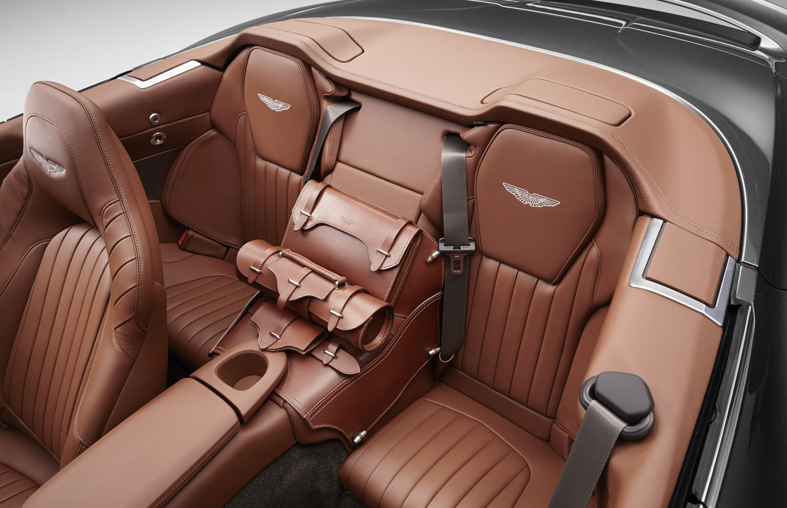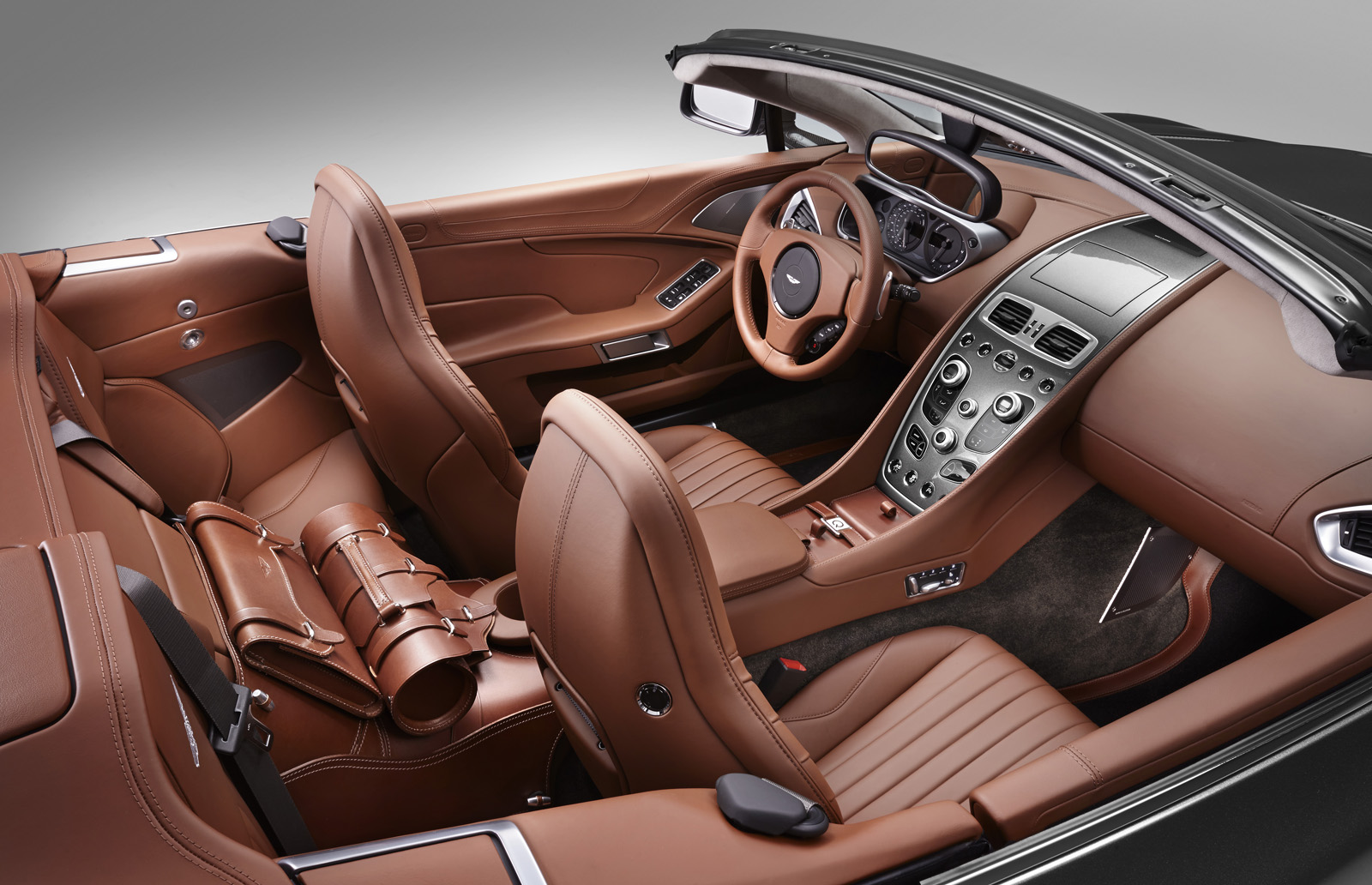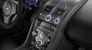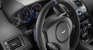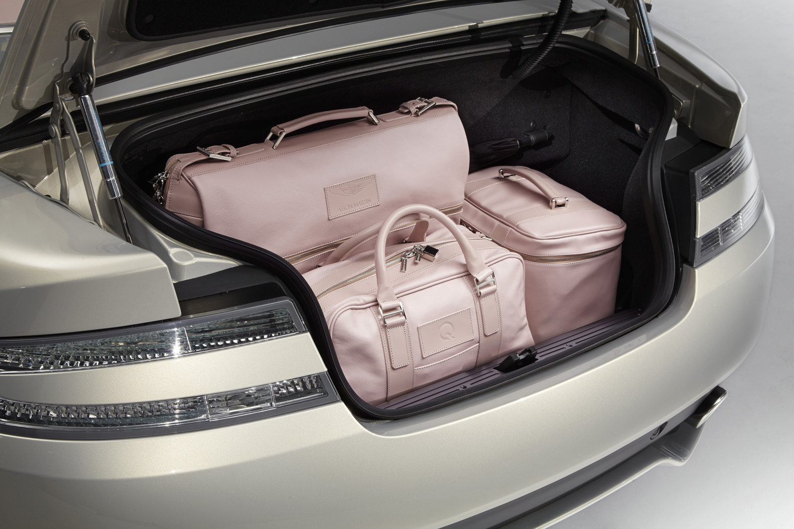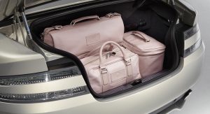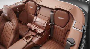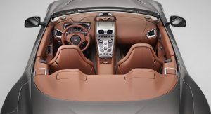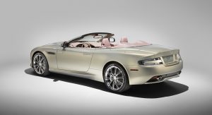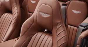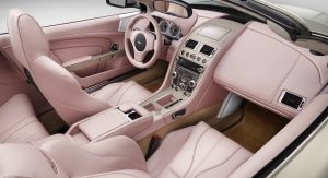 The Q by Aston Martin DB9 Volante sports probably the most controversial color combination: an Ashen Blonde exterior with polished alloy wheels paired to a blush pearl leather interior (which looks very much like pink to me). Aston Martin says the Piano Ice Mocha fascia draws inspiration from luxury furniture, as does the blanket stitch that runs the length of the central spine of the interior.
