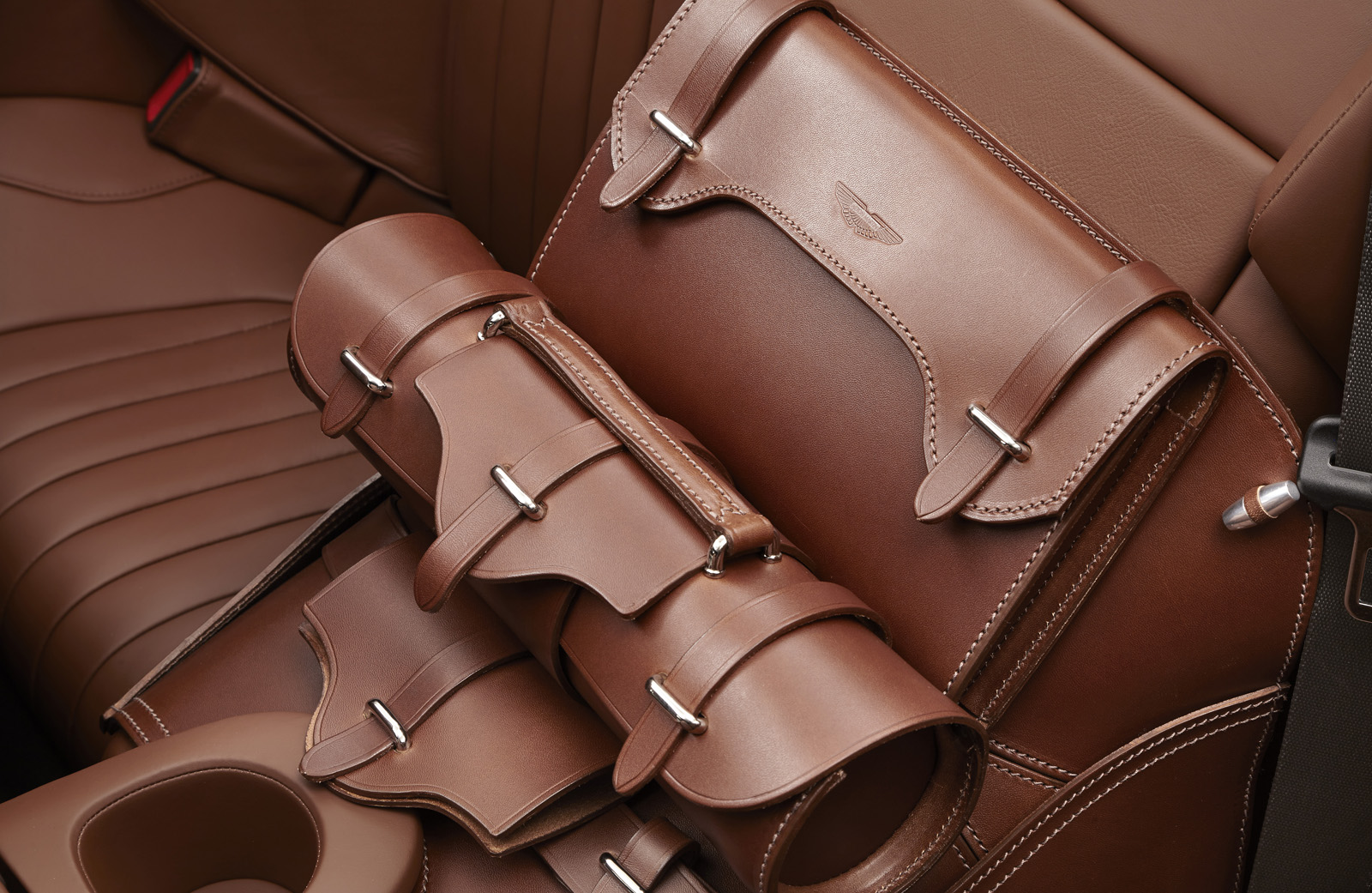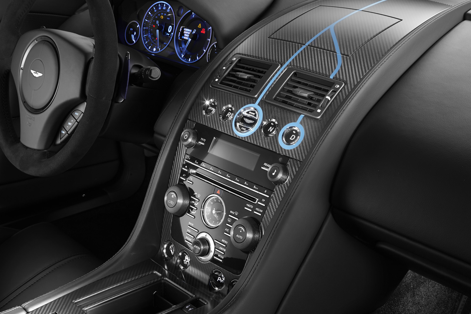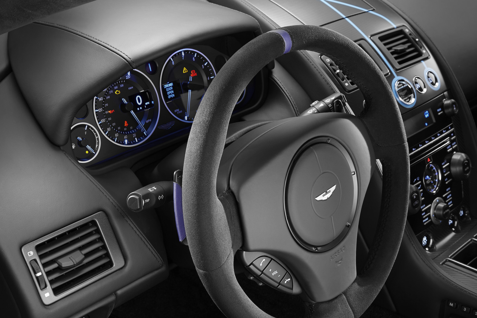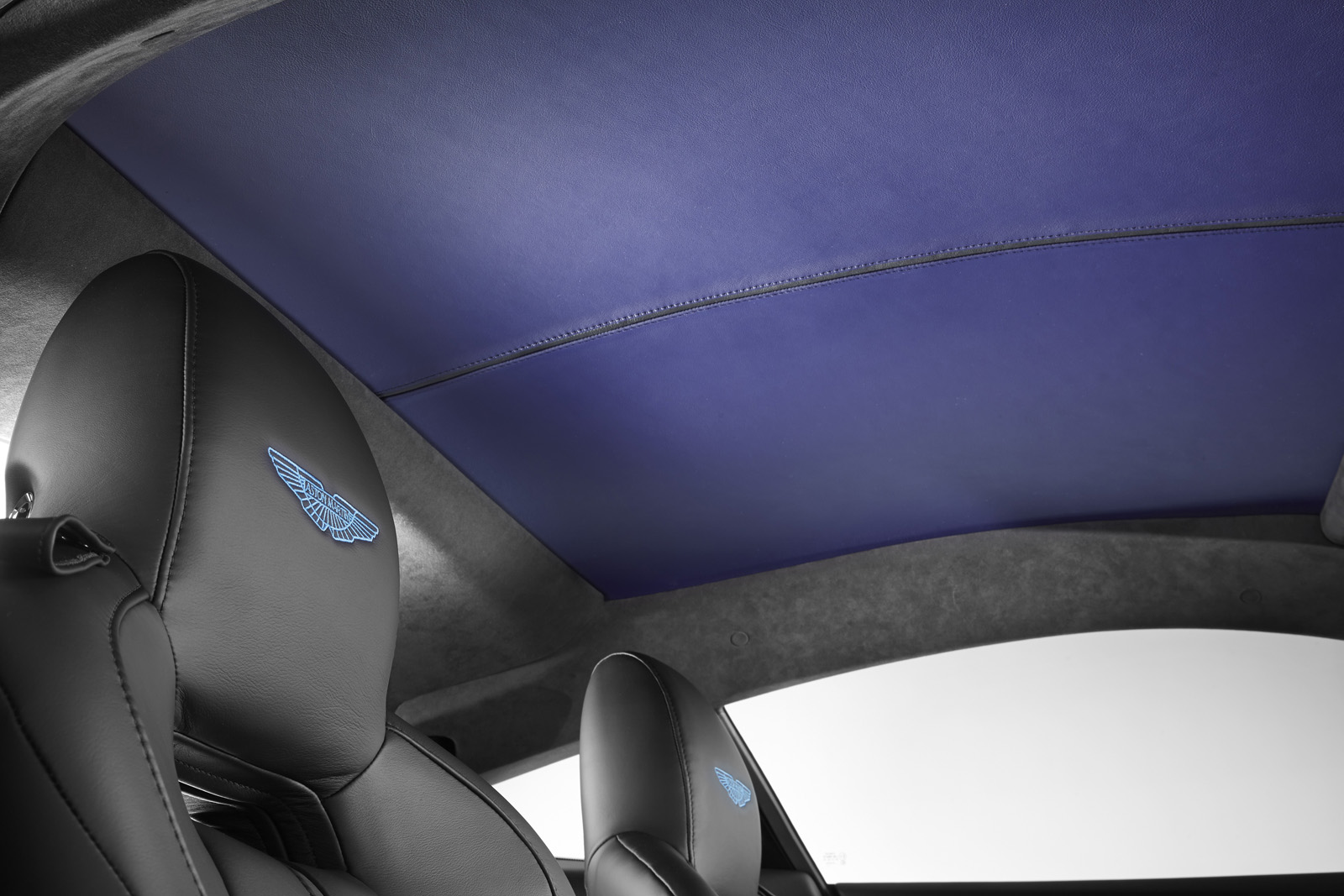 The Q by Aston Martin DB9 Volante sports probably the most controversial color combination: an Ashen Blonde exterior with polished alloy wheels paired to a blush pearl leather interior (which looks very much like pink to me). Aston Martin says the Piano Ice Mocha fascia draws inspiration from luxury furniture, as does the blanket stitch that runs the length of the central spine of the interior.