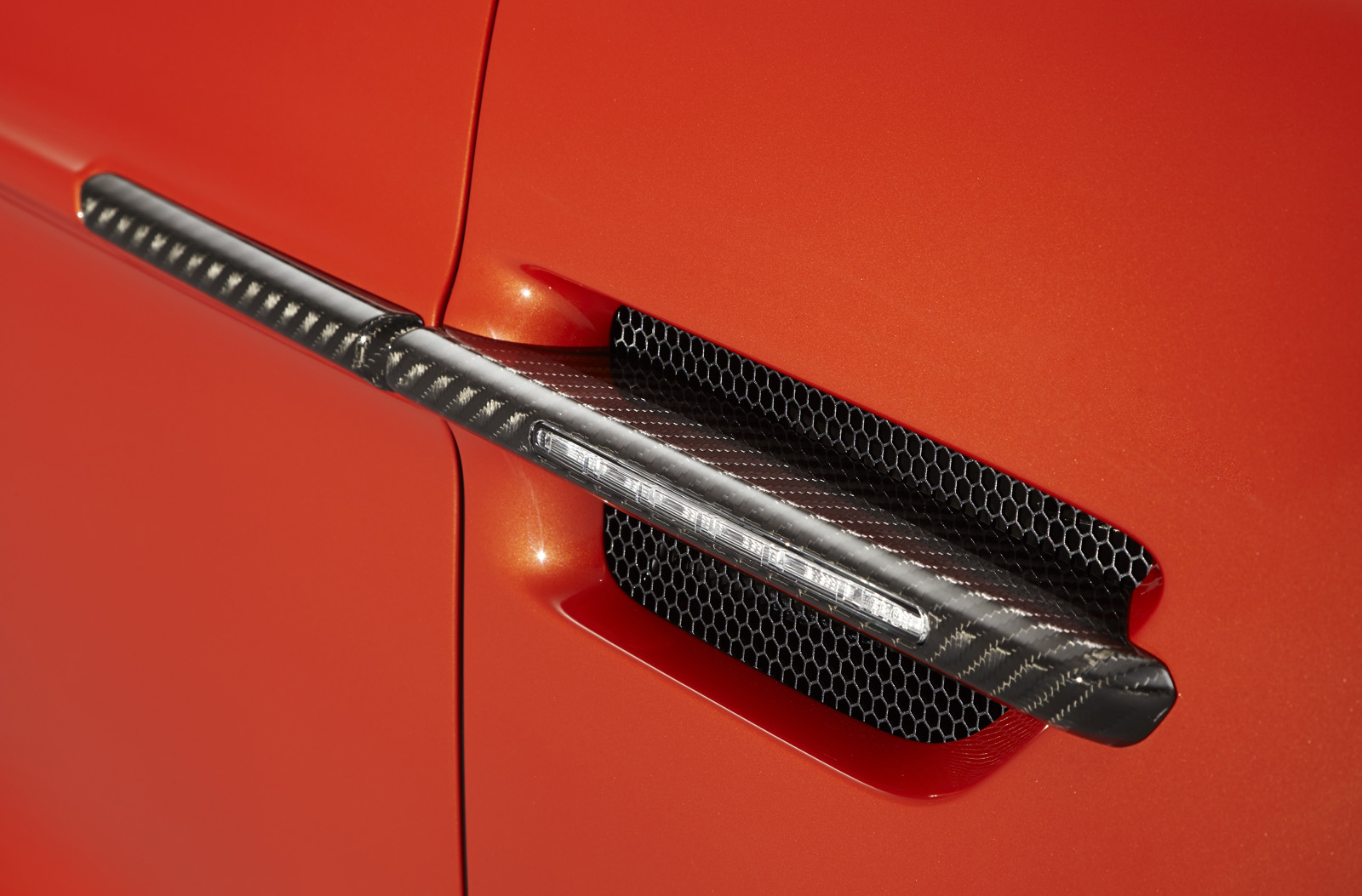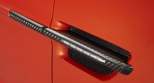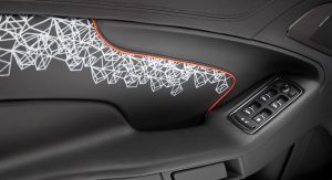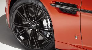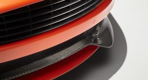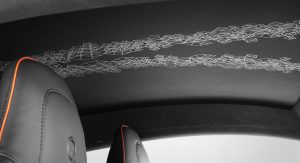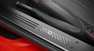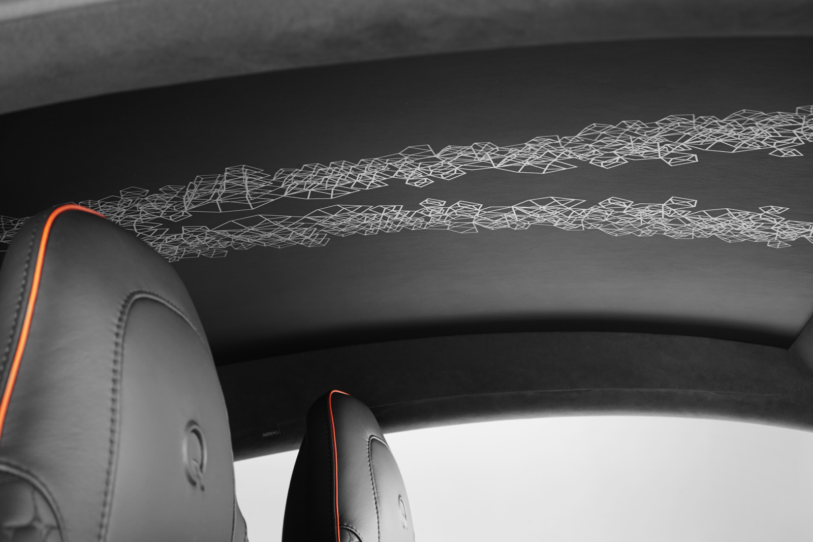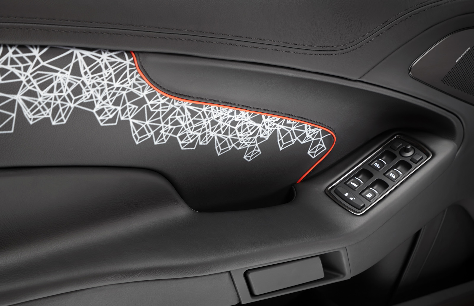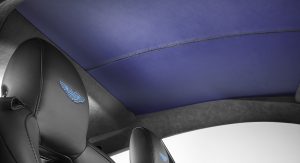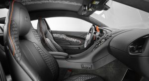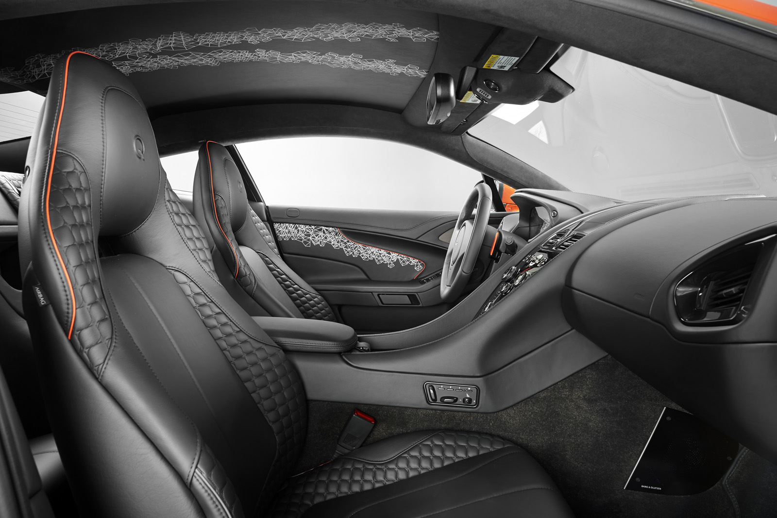 The Q by Aston Martin Vanquish Coupe features strong colors and an enlarged carbon fiber weave structure. The Abor Orange paint with a shimmering pearl effect contrasts with the carbon fiber parts, while the Obsidian Black leather interior has printed segments in a design called “Helix”, inspired by a carbon molecule helix. The Helix print crosses the leather headliner panel and can be found on the door panels as well.