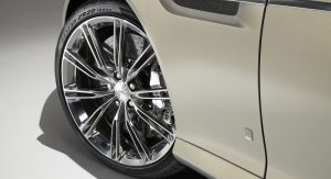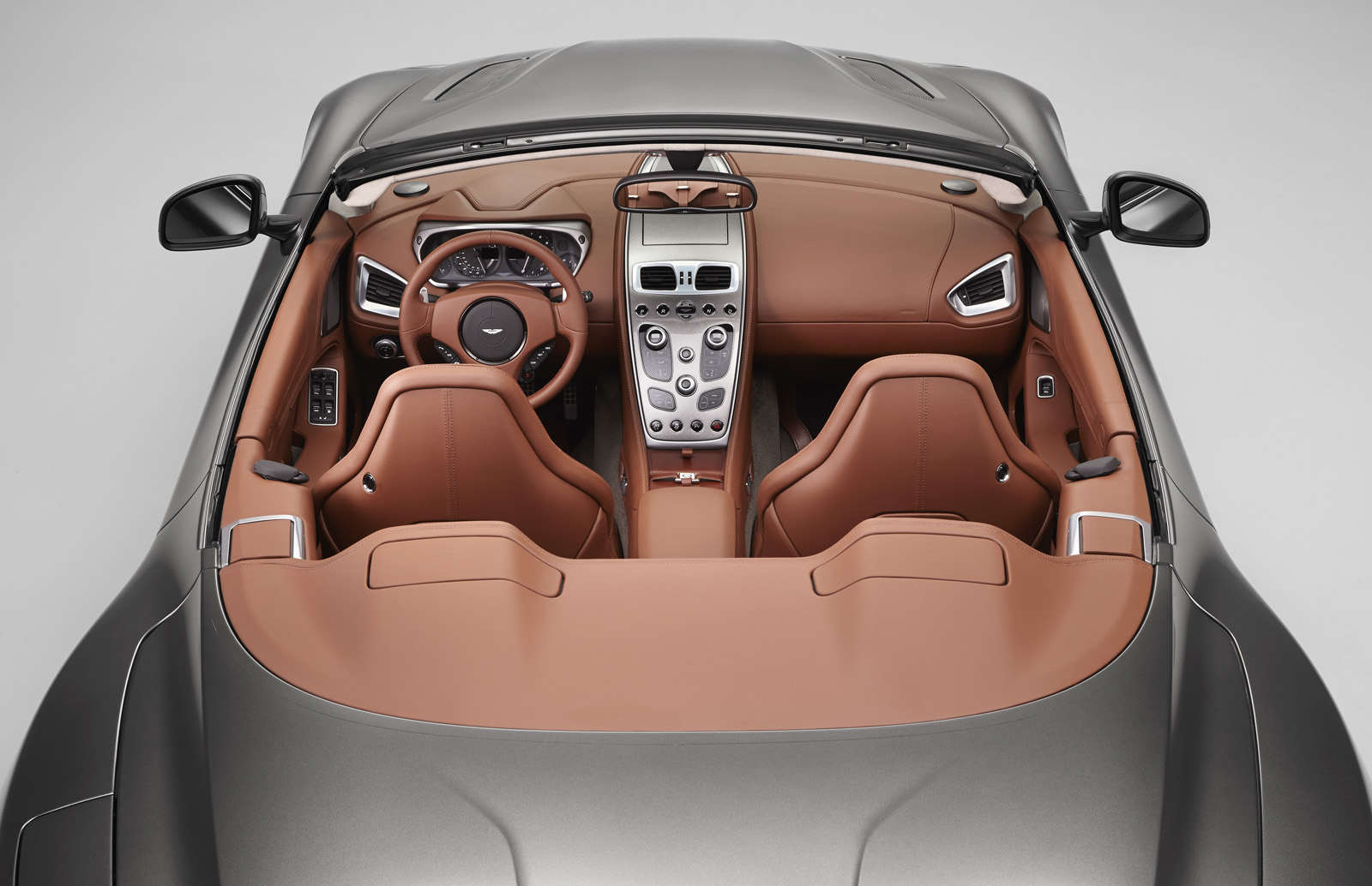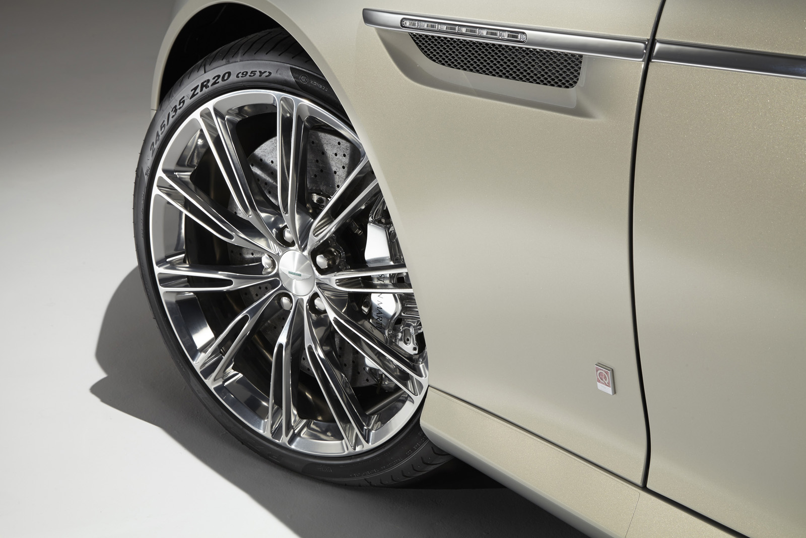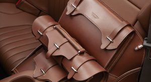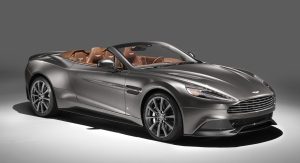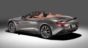 The second Vanquish bespoke model is a Volante painted Frosted Silver riding on graphite-finished 10-spoke alloy wheels with classically styled polished calipers in Solid Sterling Silver, the same color sported by the Aston Martin wings and Q badges. The interior features classic Chestnut Tan leather, with the fluted seat pattern paired with horse saddle leather.