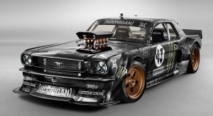 The Ford Hoonicorn RTR has been built over a period of two years at ASD Motorsports in Charlotte, North Carolina, and is now on display at the SEMA Show in Las Vegas. Based on a 1965 Ford Mustang notchback, the car was heavily modified by RTR and ASD Motorsports to feature a 410 cubic inch (6.7-liter) Roush Yates V8 producing 845 hp, mated to a one-off Sadev all-wheel drive system.