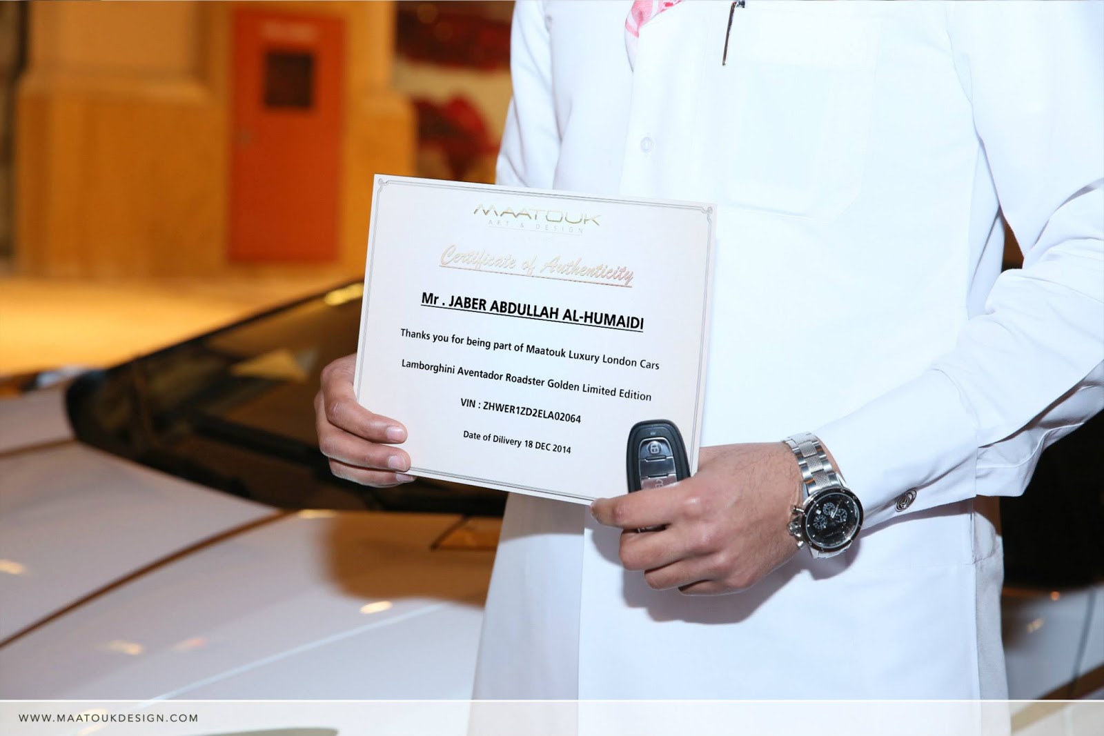 The specially tuned Aventador with the real gold-plated accents, both inside and outside, was a custom order from Qatari Businessman Mr. Jaber Bin Abdallah Al Hmaidi who the company says, “requested to modify this car and make it ready for the Qatar National Day 2015 festivals”.