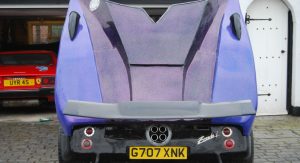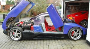 “What is left to do… finish polishing, fit new Lotus Elise screen (which I will supply), connect windscreen wiper, fit horn (supplied) and fit screen washer (not supplied), connect the blower to dash vents. Calibrate speedo. The car could also do with a new battery.. Then take it to your friendly IVA tester. The car has the logbook for the Scorpio which was updated when the Zonda had its V12 Jag engine. So in theory the car is a V12 Scorpio, the registration number fitted to the rear is from the Scorpio and the car is SORN. I have no idea is you can use the number plate and it will be your responsibility to ensure its all legal before using on the road. Please remember this is not a kit car, it is entirely handmade from scratch.”