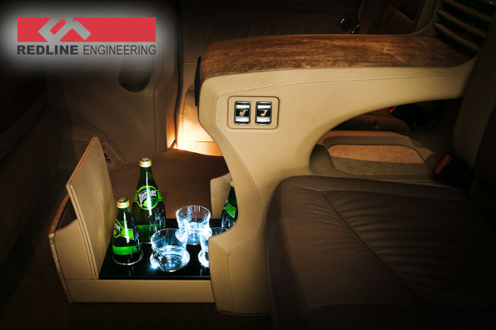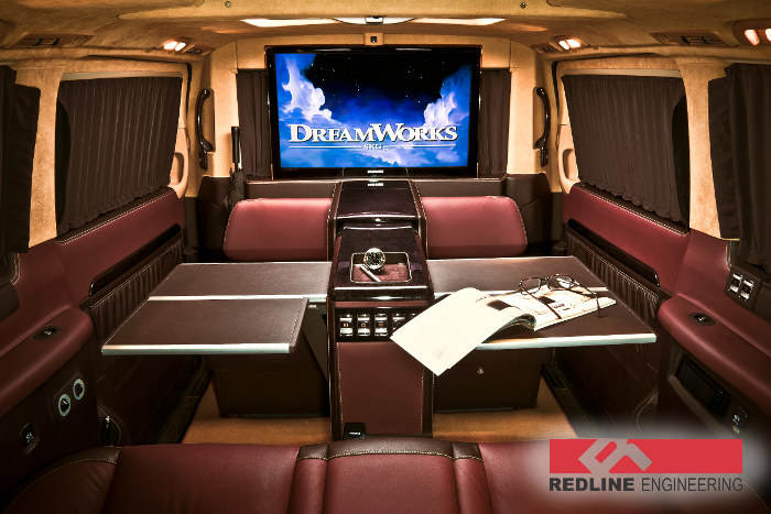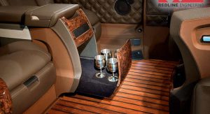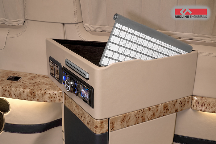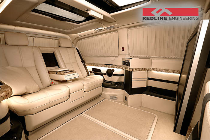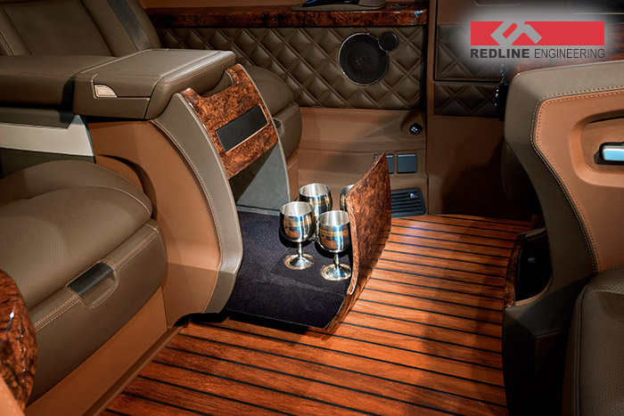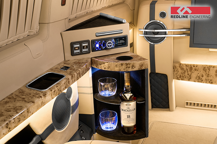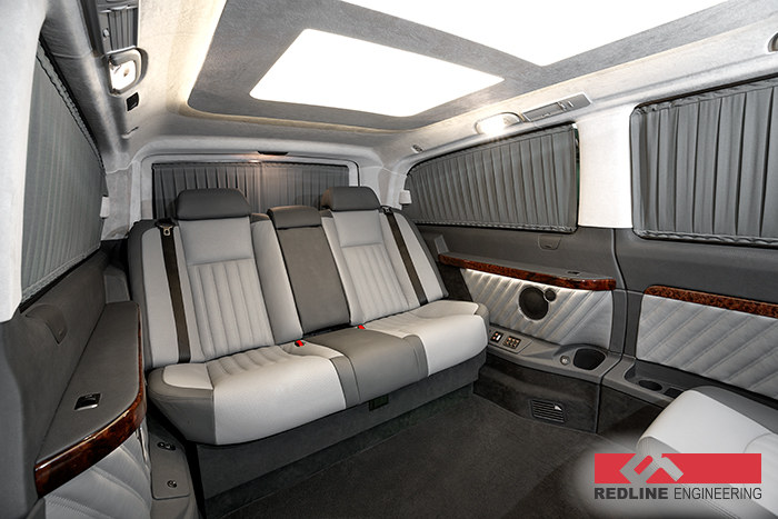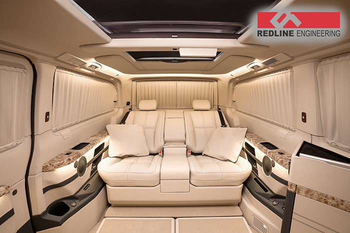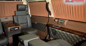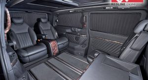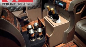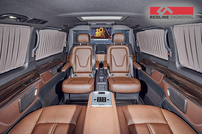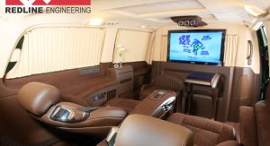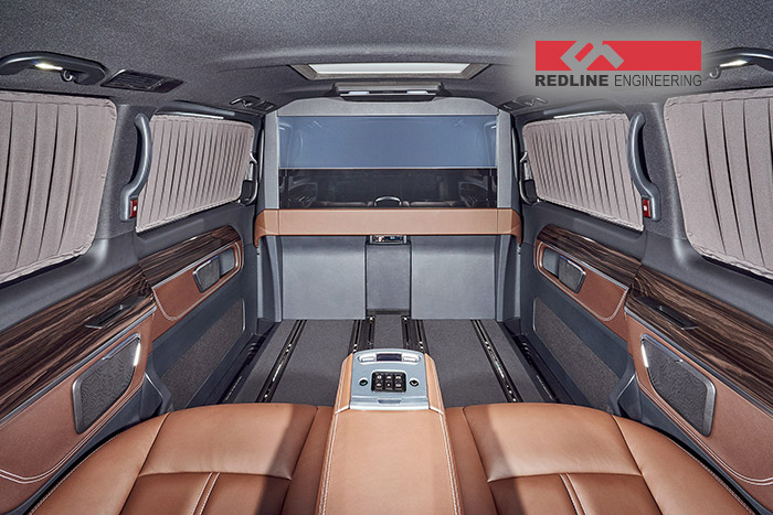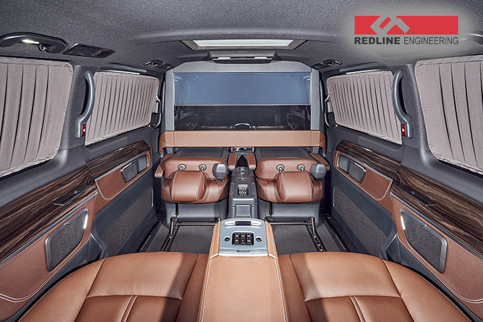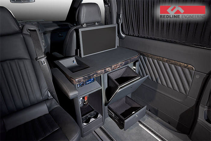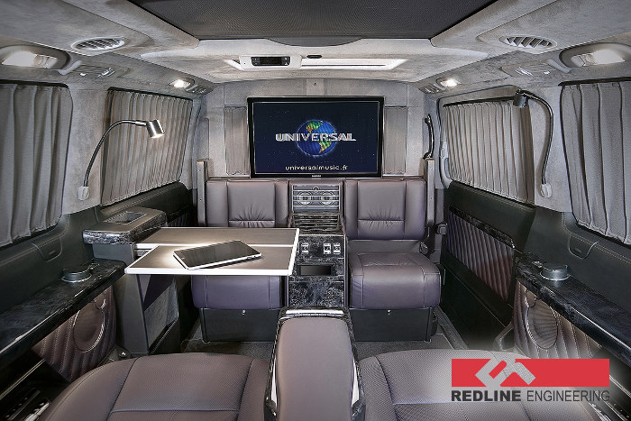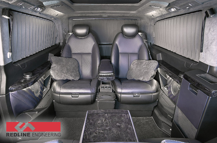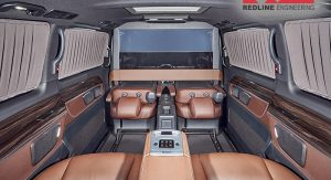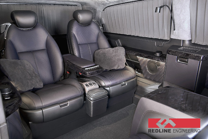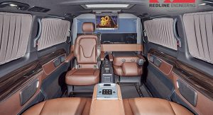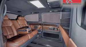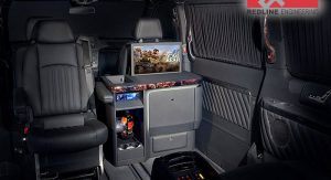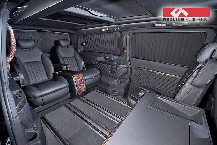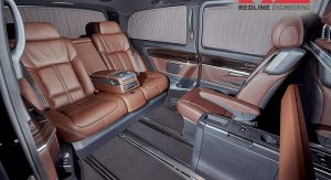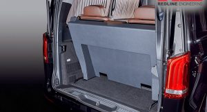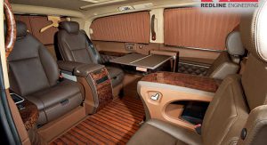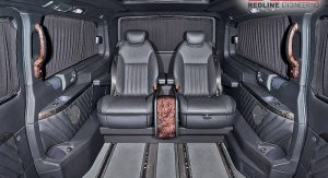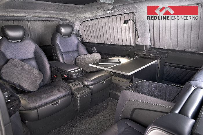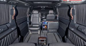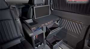 Shown in the first six photos in the gallery, Redline’s V-Class Portable Office gets a rear passenger compartment isolated from the front cabin through a partition, with a rear seat bench taken off a BMW 7-Series F01 and two rear-facing independent seats that can be removed (we’re not sure from which vehicle these were sourced, but they definitely don’t match…).