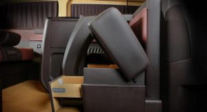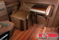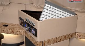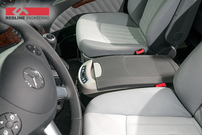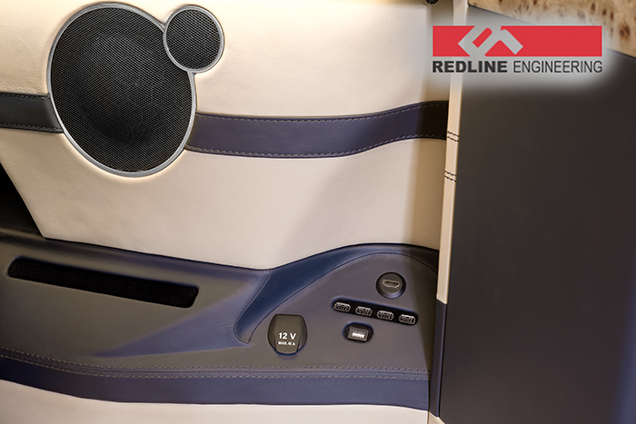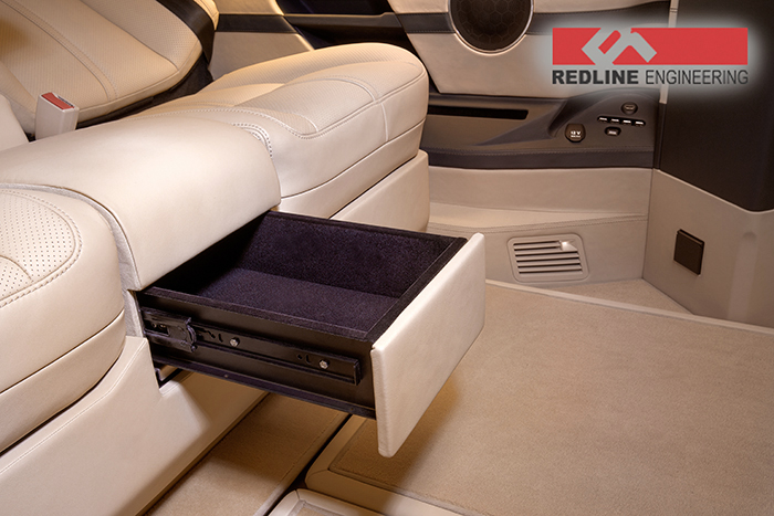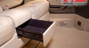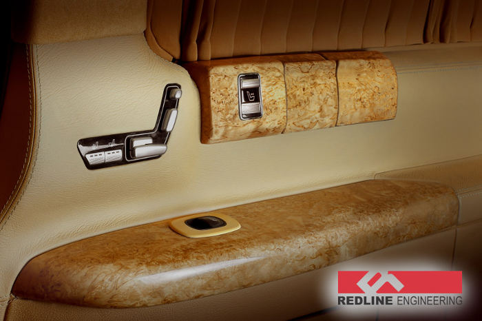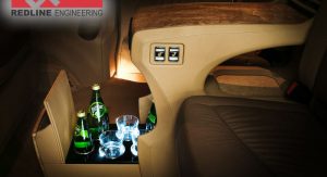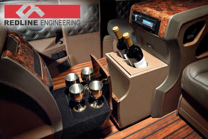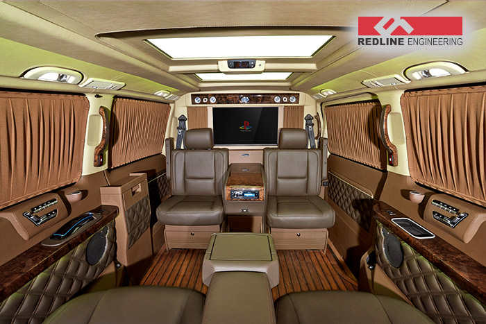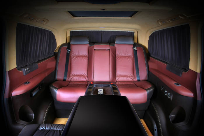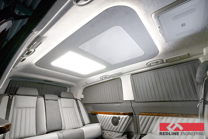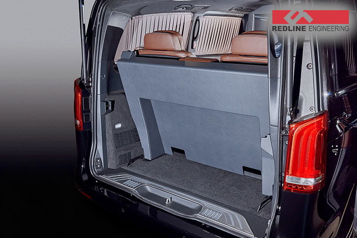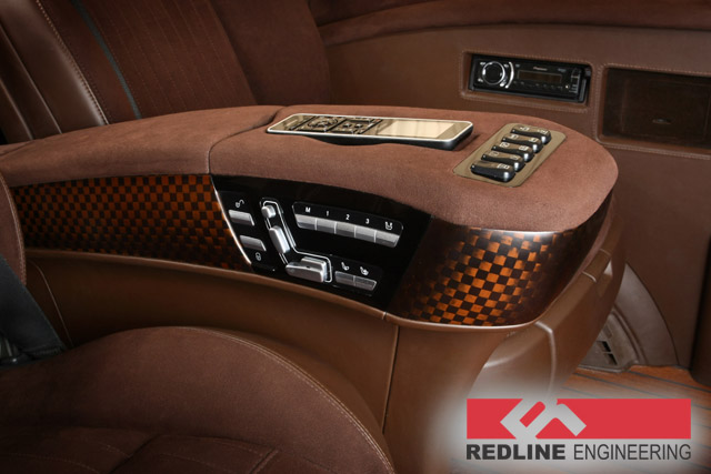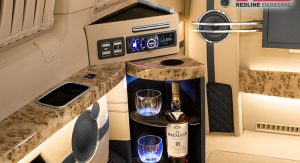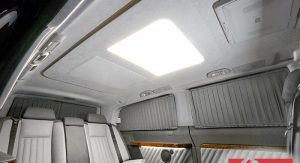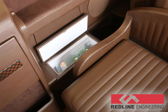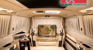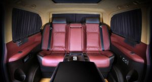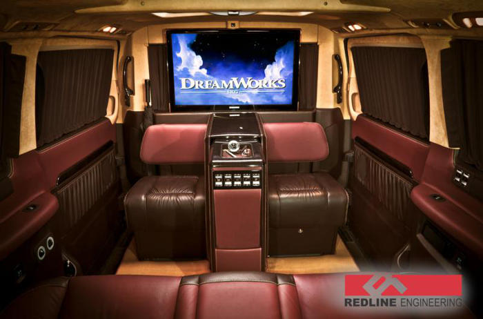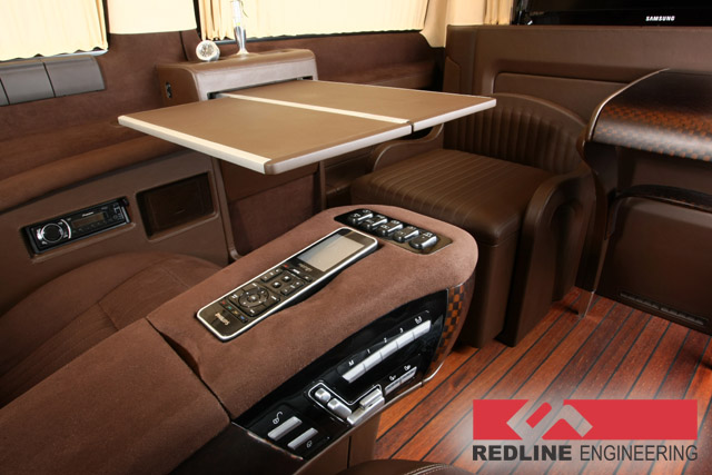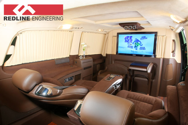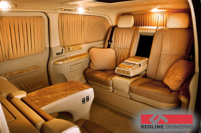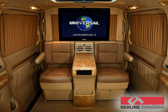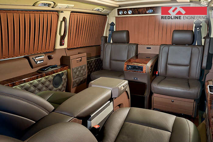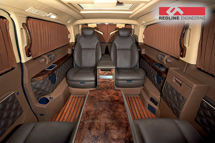 Shown in the first six photos in the gallery, Redline’s V-Class Portable Office gets a rear passenger compartment isolated from the front cabin through a partition, with a rear seat bench taken off a BMW 7-Series F01 and two rear-facing independent seats that can be removed (we’re not sure from which vehicle these were sourced, but they definitely don’t match…).