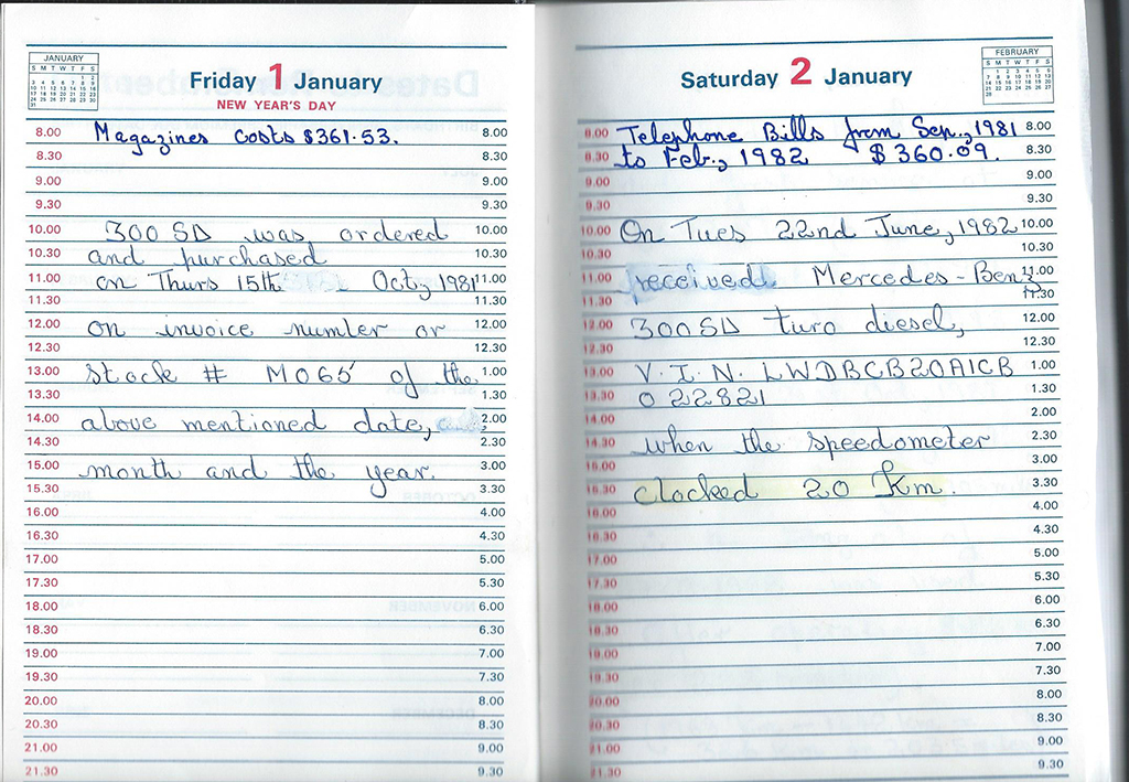 Additional Documents include: Original sales order – Insurance receipt June 22, 1982 – Statement of Vehicle Origin/Social Service Tax Return – Owner’s certificate of Insurance/Vehicle License June 22, 1982 – Hand written maintenance log – Hand written fuel log – Fuel receipts – Mercedes-Benz Canada Inc. VHS videos: “Celebration” and “The S Class in action” and “Mercedes-Benz Canada Inc. Presents”