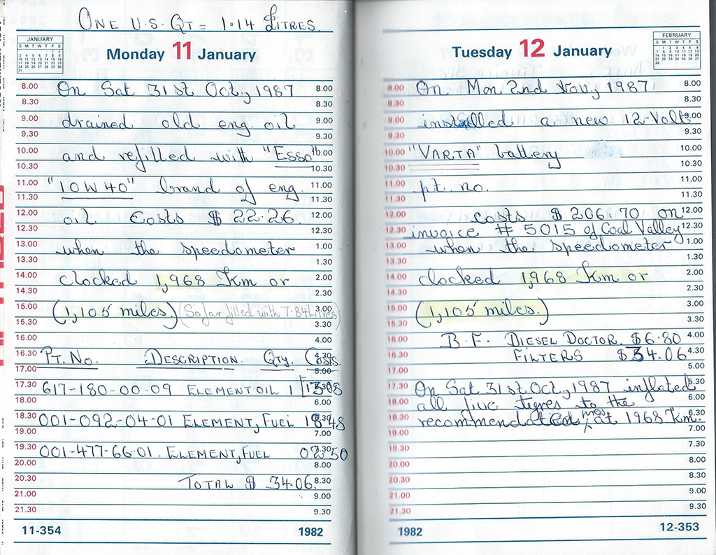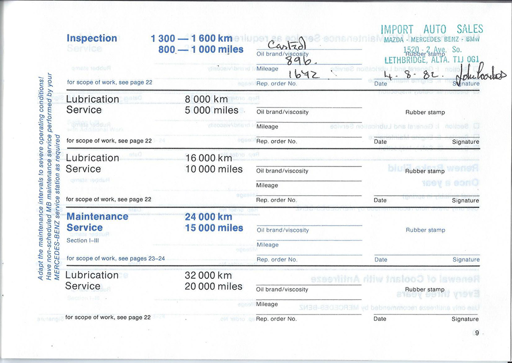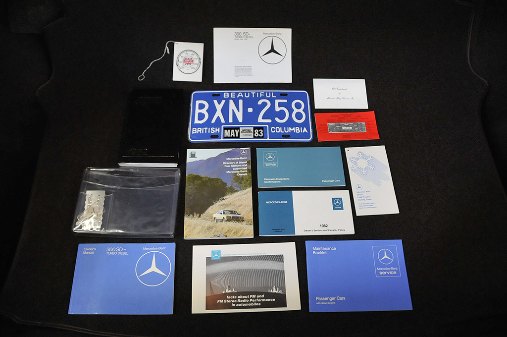 Handbooks include: Wallet key – Data plate – Becker Grand Prix operation instructions – Diesel Fuel directory – Owner’s handbook – Diesel Cold weather starting guide – MB consumer information pamphlet – Small service reminder booklet – Corrosion Inspections Confirmations – 1982 Service and Warranty Policy – FM reception fact booklet – Maintenance Booklet – Quick reference placards – Mercedes-Benz Canada Inc. thank you card.