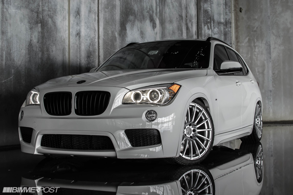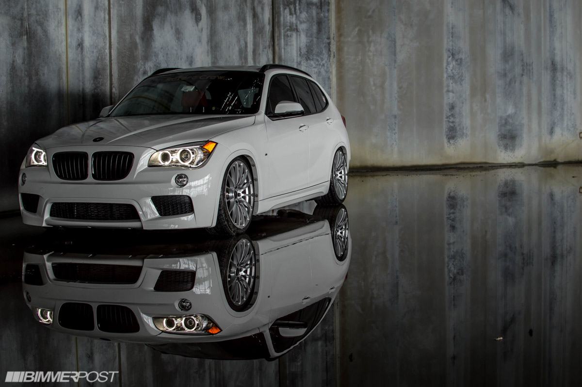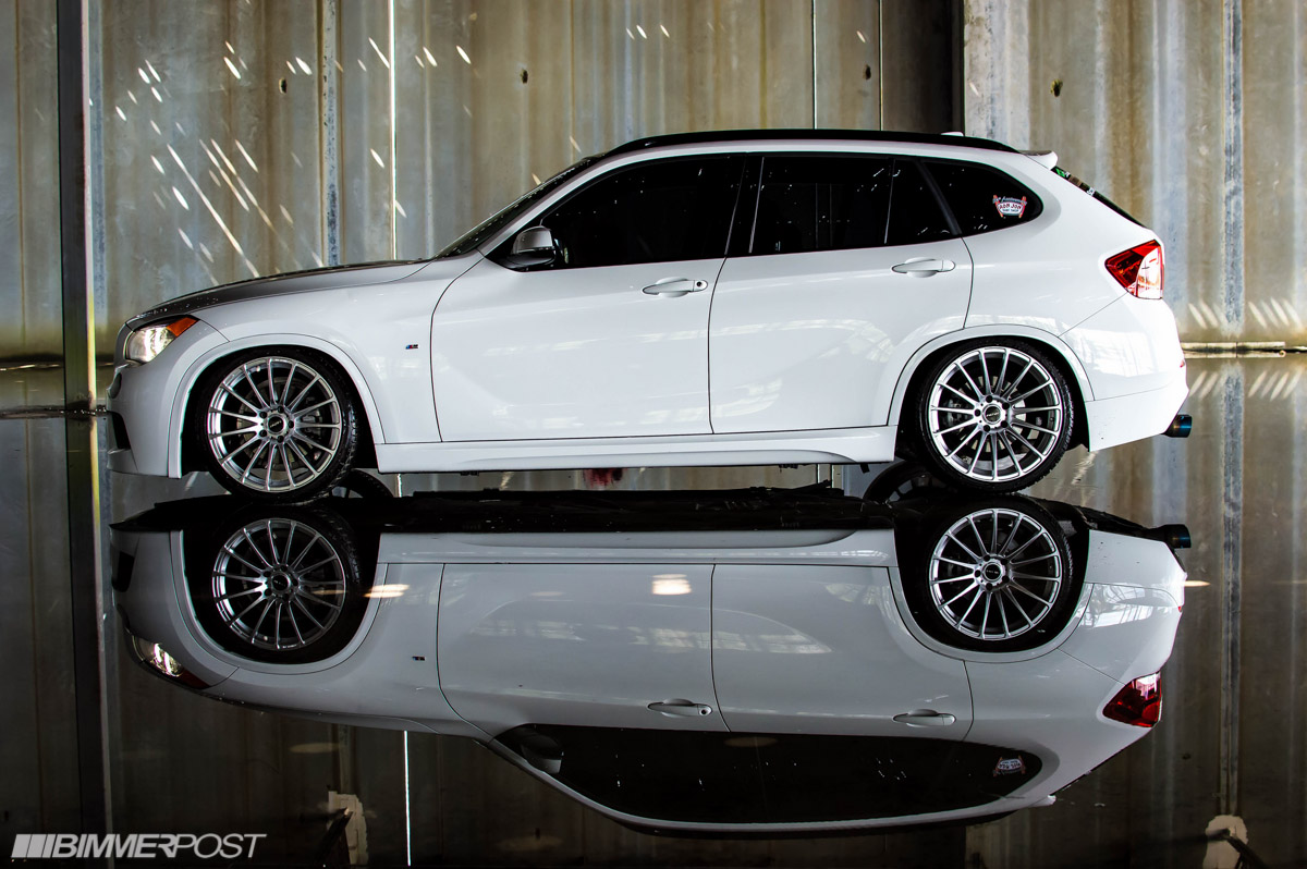 This leads to some gorgeous reflections that make this Mineral White, stanced BMW X1 really stand out. The car itself is a rear-drive 28i, with the M-Sport pack, riding on some nice multi-spoke rims and it’s had its ride height noticeably dropped.