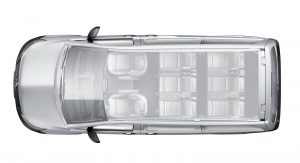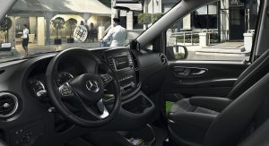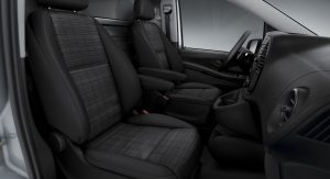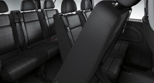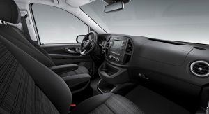 Standard safety equipment includes 6 airbags for the Cargo Van and 8 airbags for the Passenger Van, with all models also getting Attention Assist, Crosswind Assist, and load-adaptive ESP.