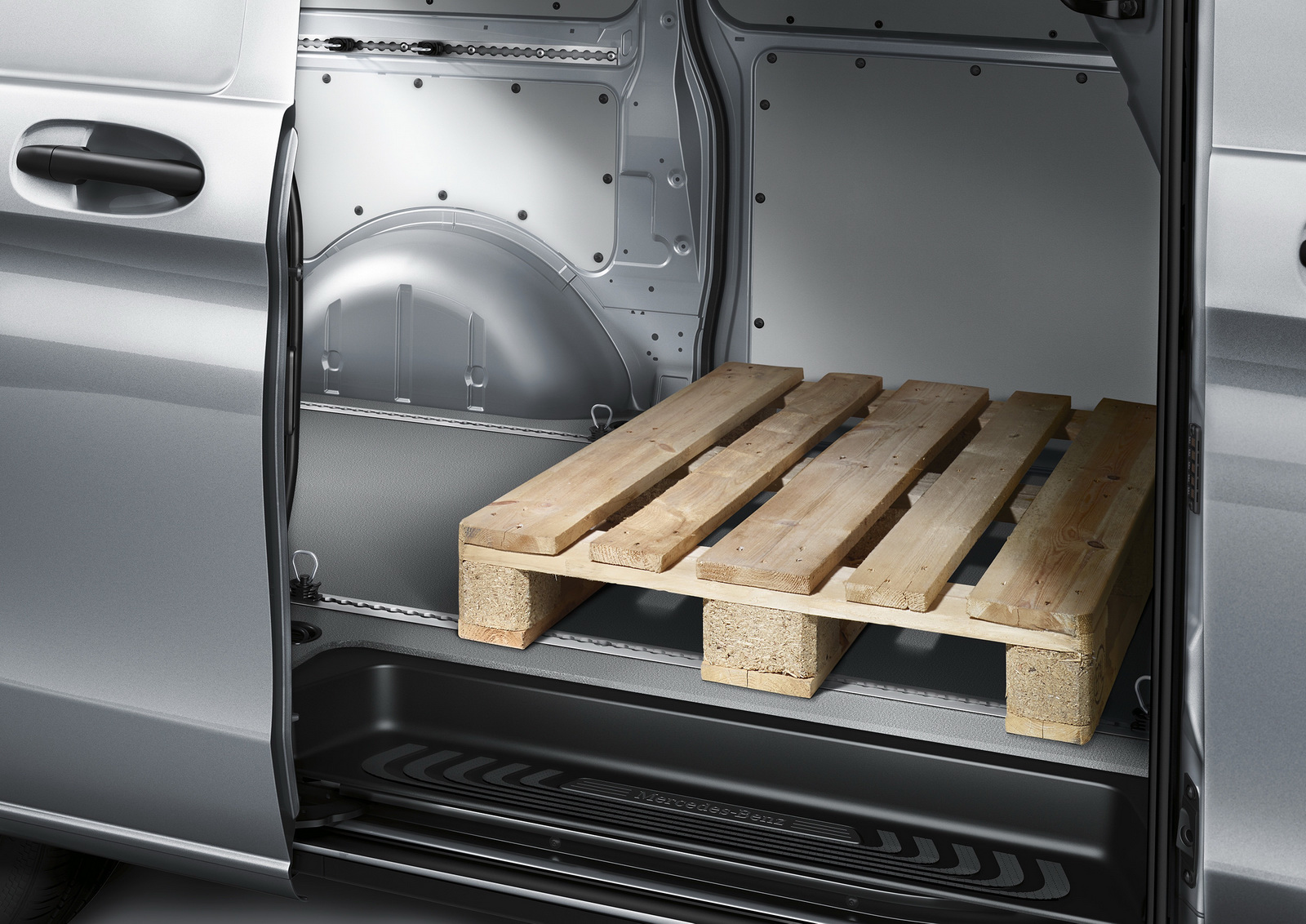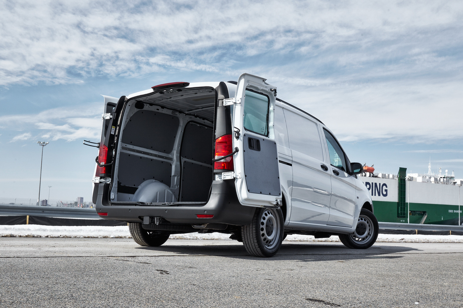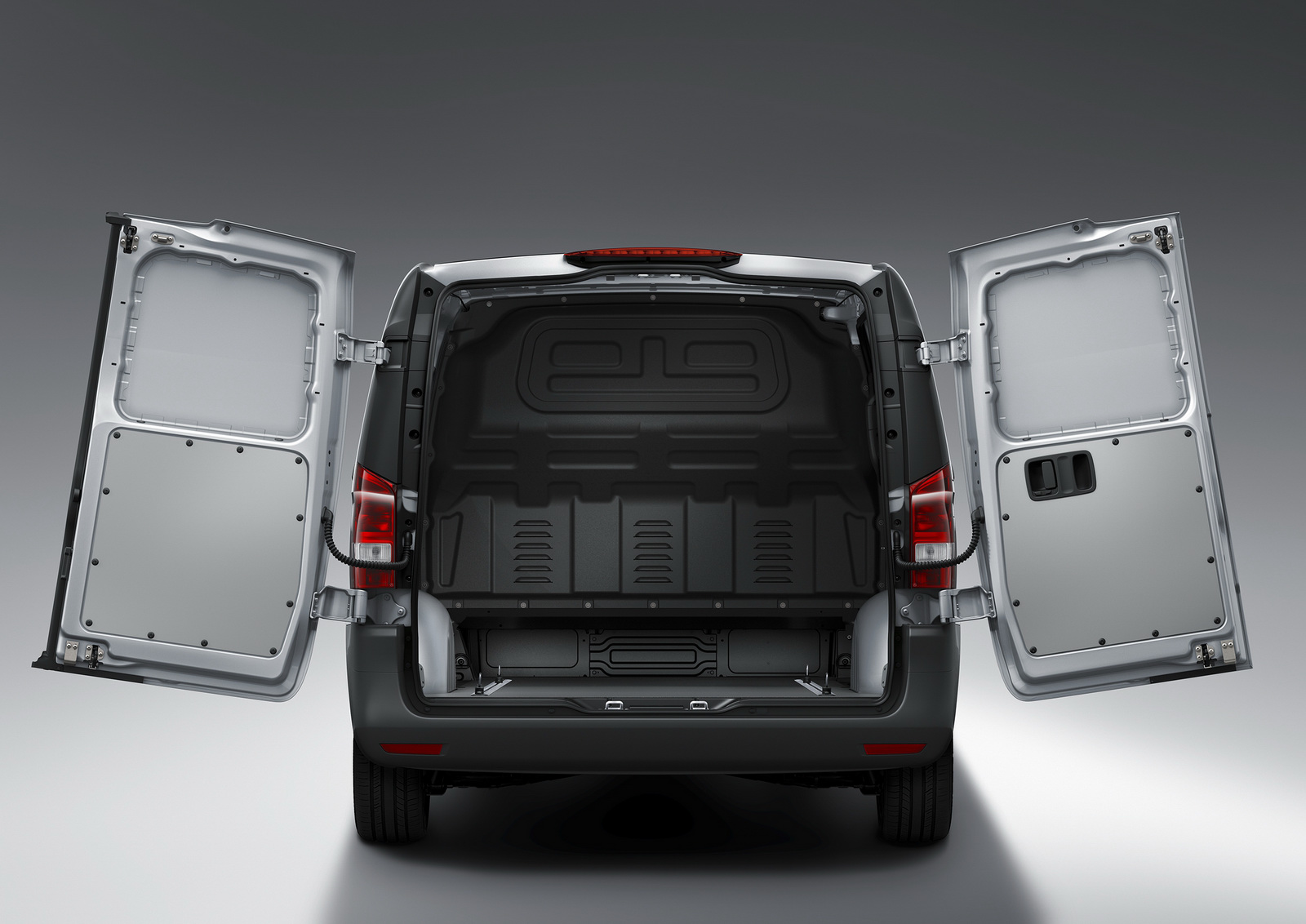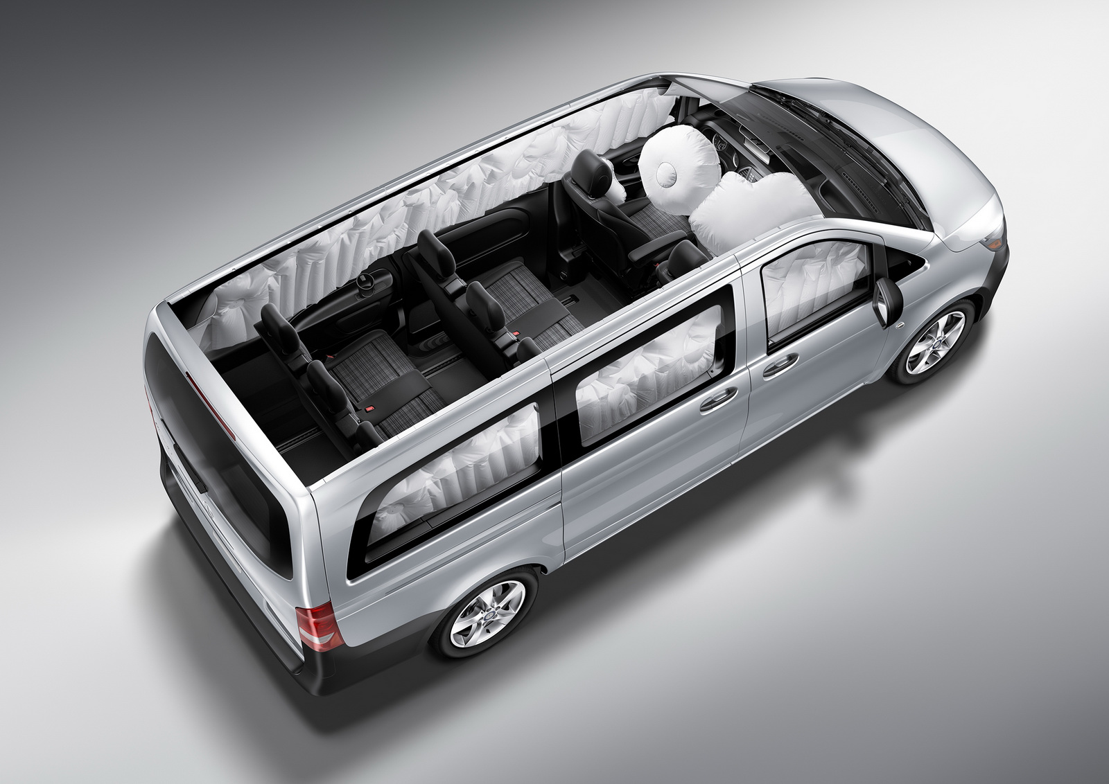Standard safety equipment includes 6 airbags for the Cargo Van and 8 airbags for the Passenger Van, with all models also getting Attention Assist, Crosswind Assist, and load-adaptive ESP.