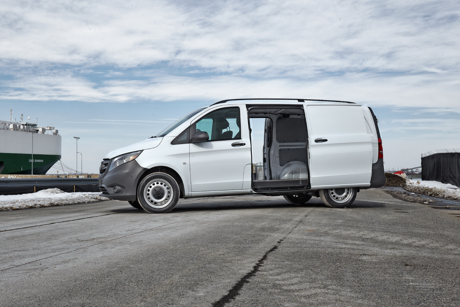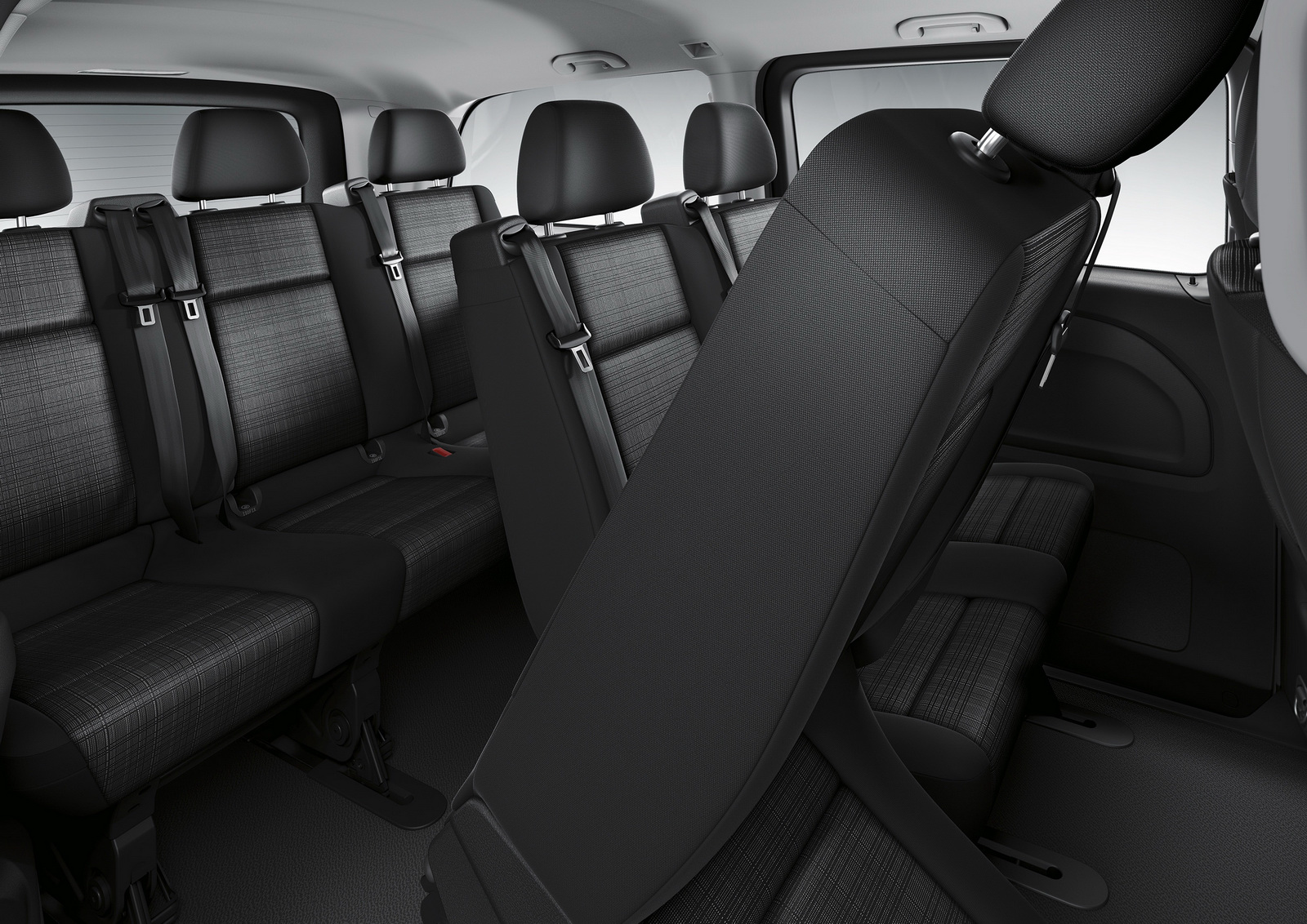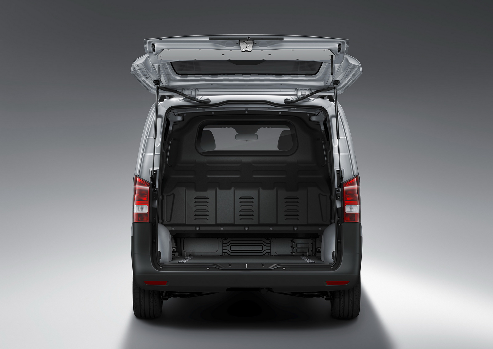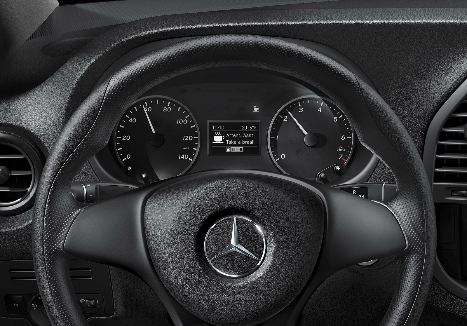 Standard safety equipment includes 6 airbags for the Cargo Van and 8 airbags for the Passenger Van, with all models also getting Attention Assist, Crosswind Assist, and load-adaptive ESP.