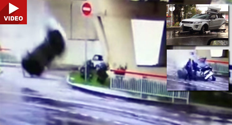 A horrific accident with a miracle outcome was captured on camera when a Range Rover Evoque slid on an icy road at speed and went flying off an overpass crash-landing a couple dozen feet below.