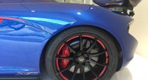 The interior is a mixture of Alcantara and carbon fiber components, with a blue center console that also features a few red elements.