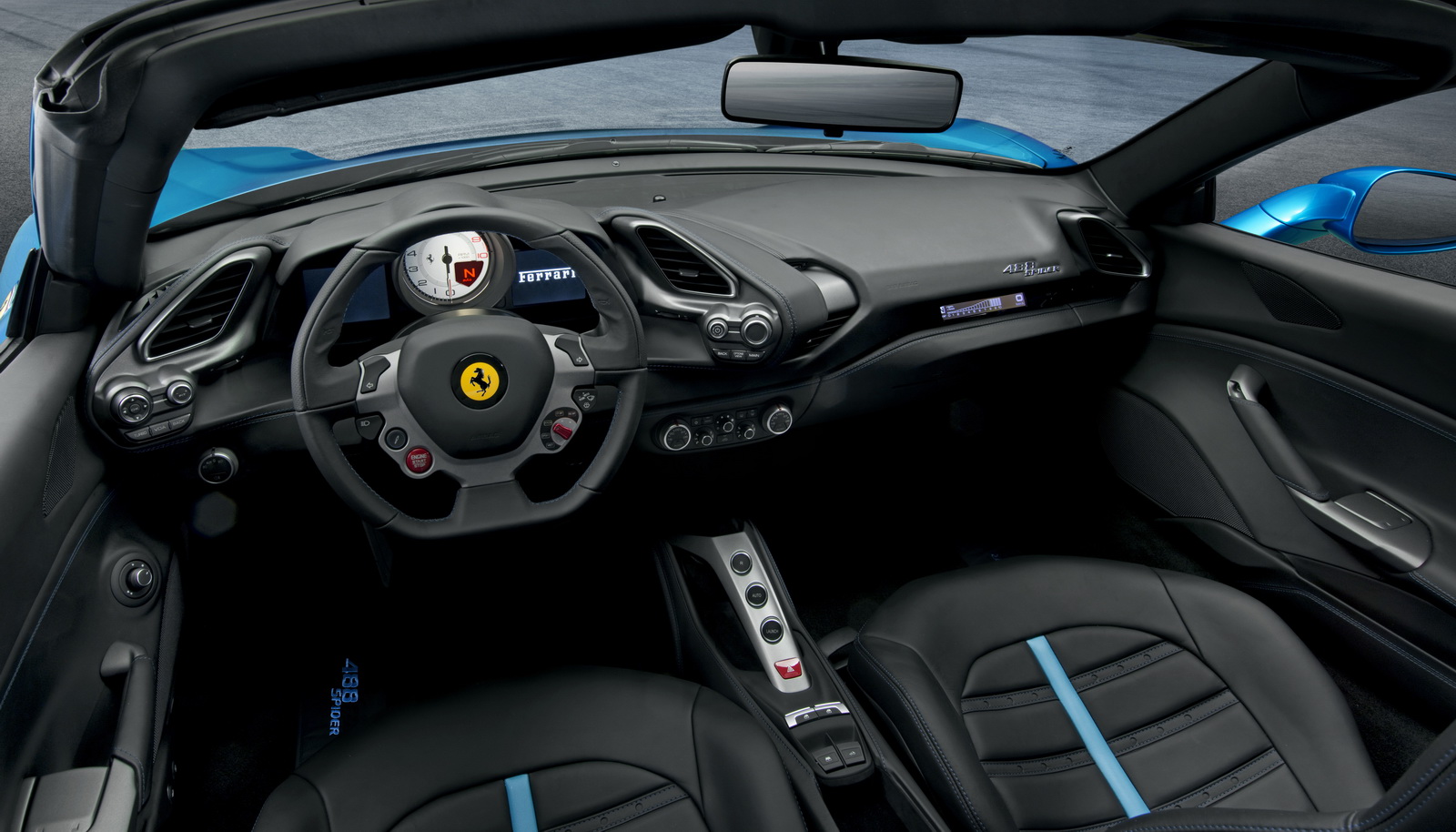 The interior comes with no surprises over the 488 GTB (except for that passenger display gizmo), but it has a few extras compared with the outgoing model. The air vents are less bulky and vertical, while the console between the seats has been replaced with a central tunnel.