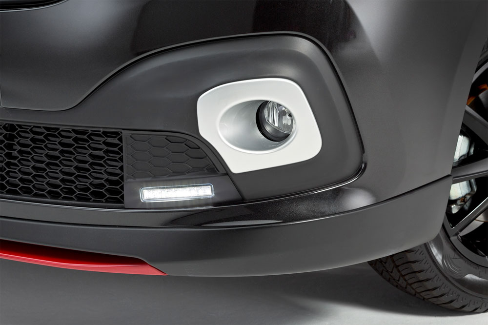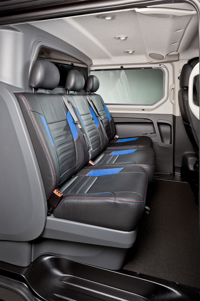 On the outside, the van gets red and blue stripes and decals, a more aggressive front fascia with white trim around the fog lights and a red painted bumper lip, as well as chrome bars on the grille. The van rides on black painted 17-inch 10-spoke alloy wheels.
