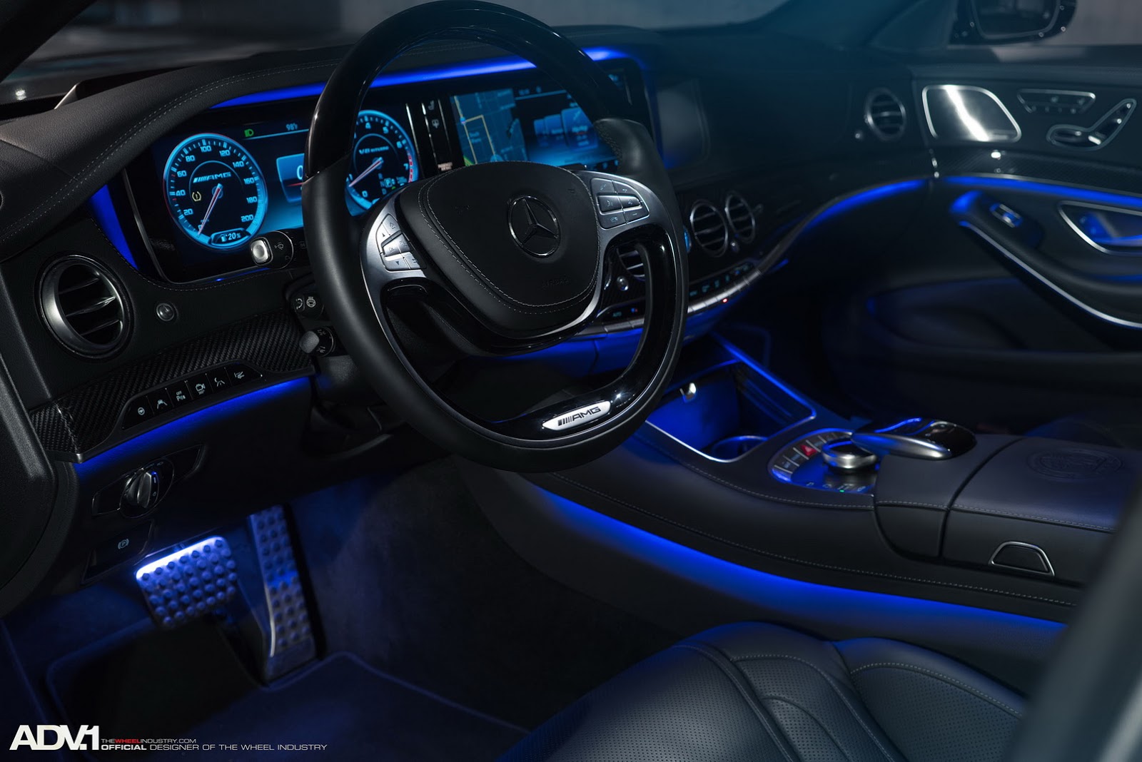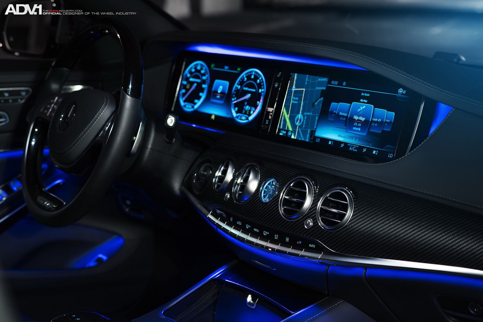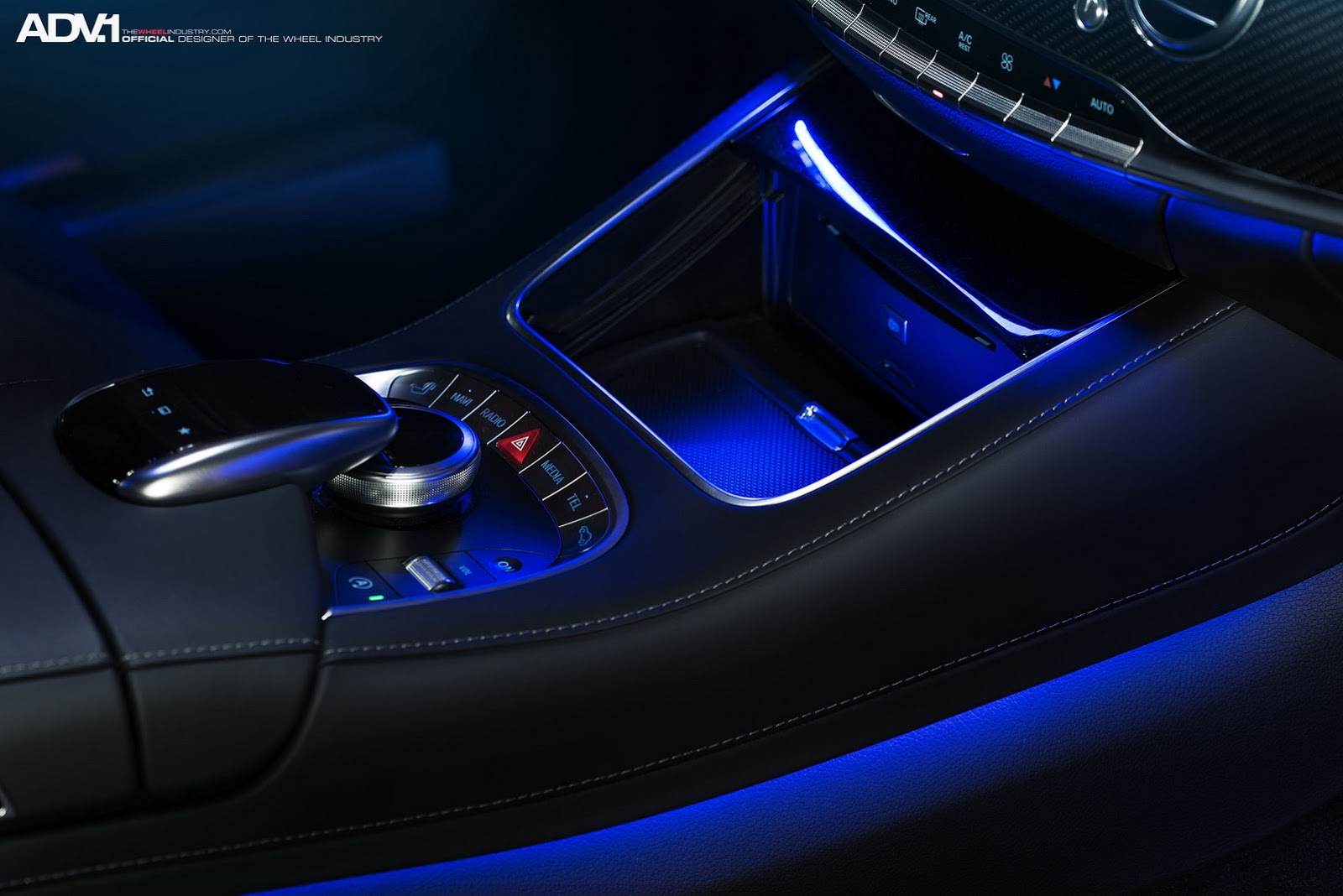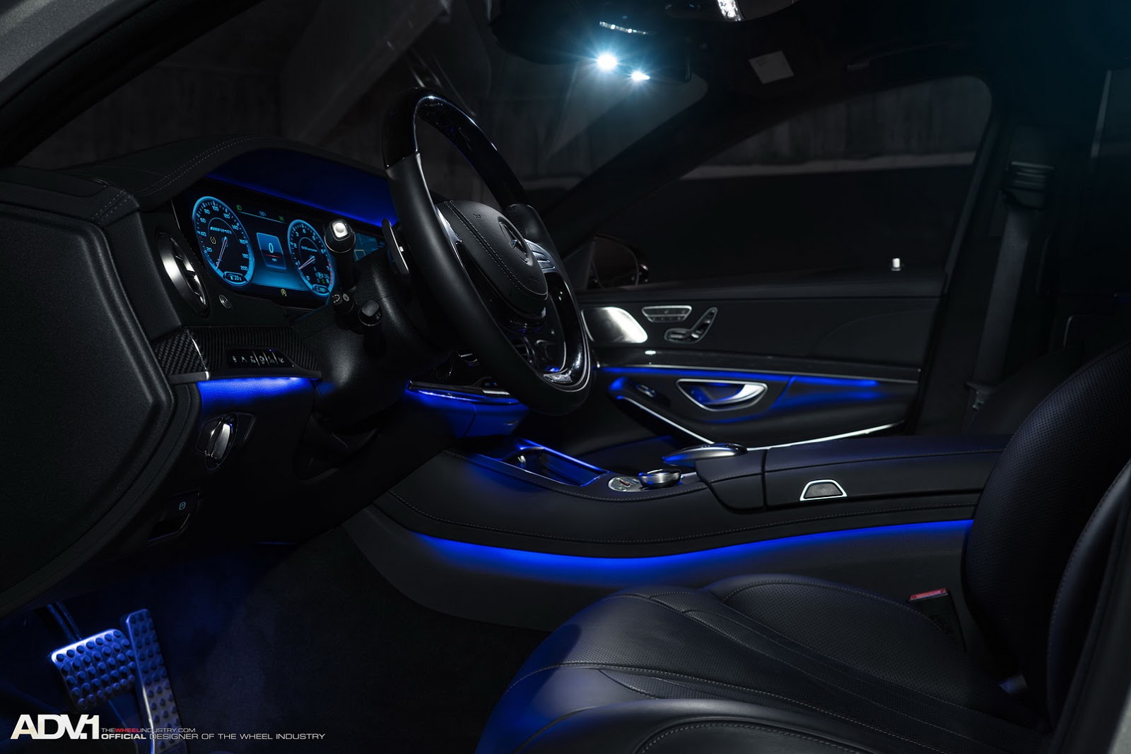 The interior features a carbon fiber strip across the dashboard as well as a blue ambient lighting theme which of course can be changed depending on personal preferences.