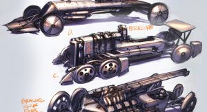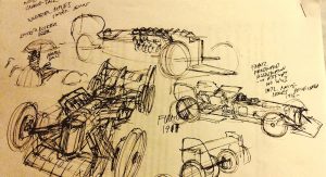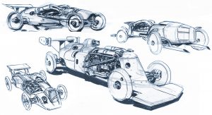 What he basically envisioned (and artistically sketched out) are mixes of period grand prix cars with period airplane bits. There’s really no right or wrong approach to making this believable and really come alive in our imaginations, but we’re happy someone came up with the idea.
