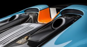 The “Gulf” lettering is embroidered into the headrests and the cabin adds the orange accents too, which are visible on the seats, steering wheel and other parts of the interior. The Burmester high-end surround sound system, along with the carbon floor mats and the Porsche Motorsport six-point racing harnesses, are also worth mentioning.