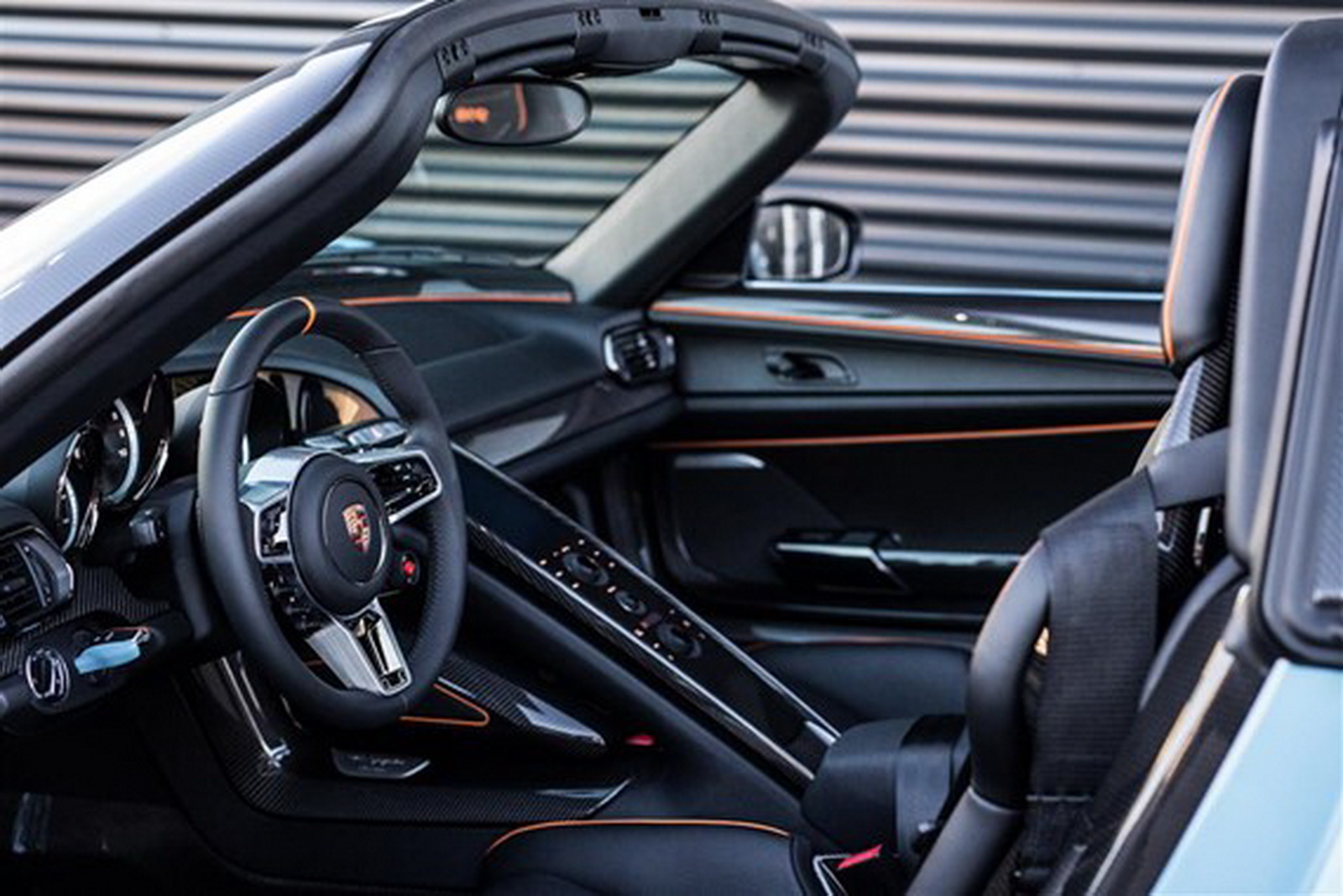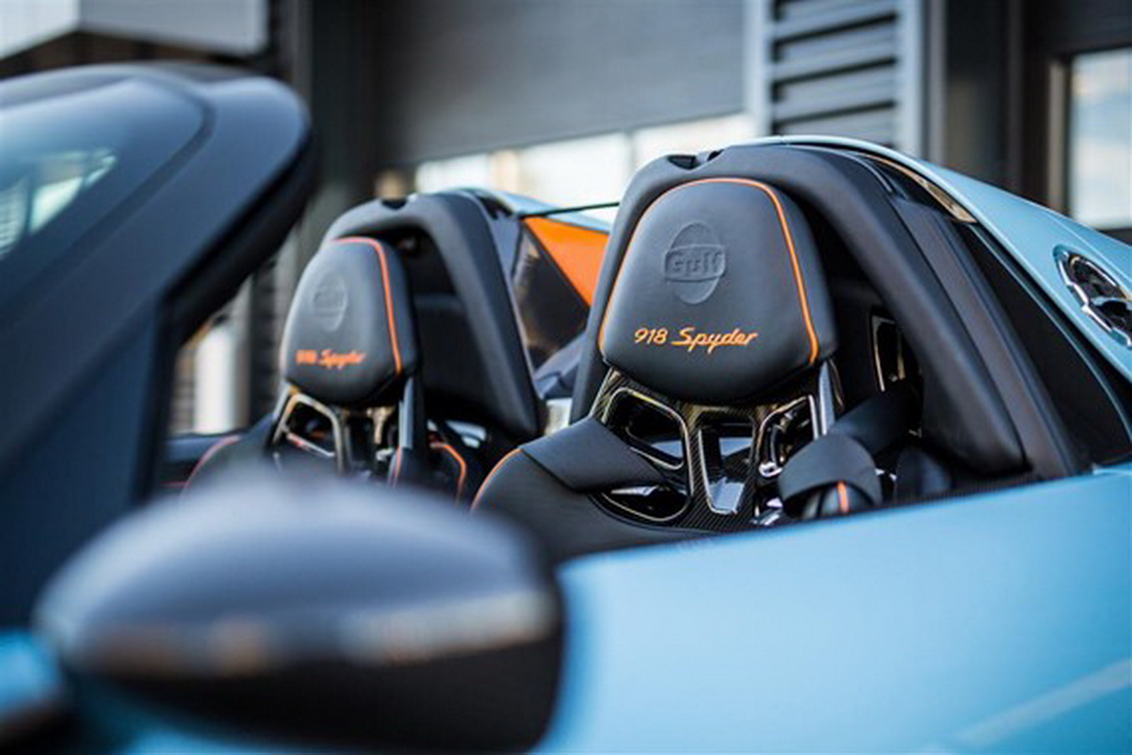 The “Gulf” lettering is embroidered into the headrests and the cabin adds the orange accents too, which are visible on the seats, steering wheel and other parts of the interior. The Burmester high-end surround sound system, along with the carbon floor mats and the Porsche Motorsport six-point racing harnesses, are also worth mentioning.