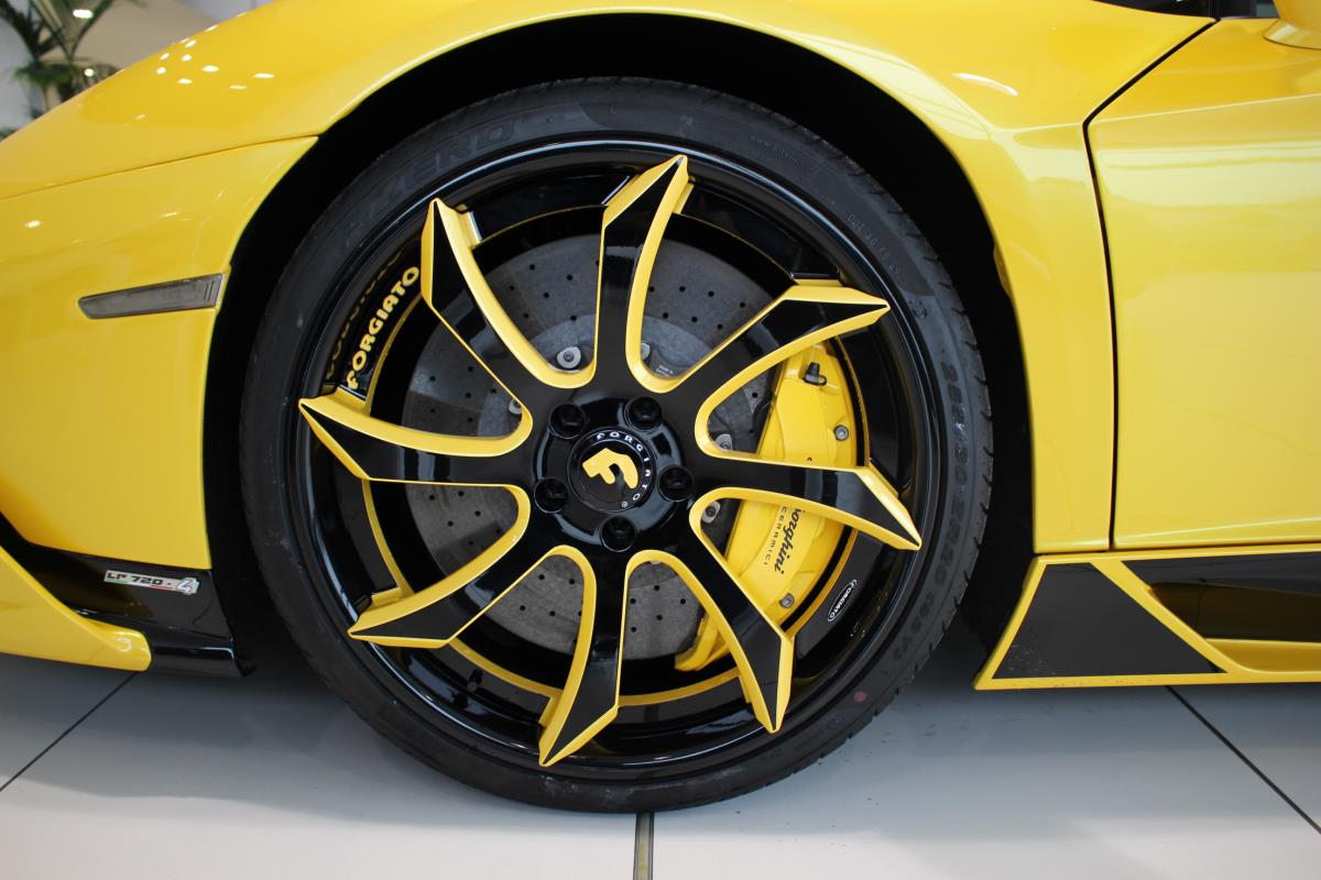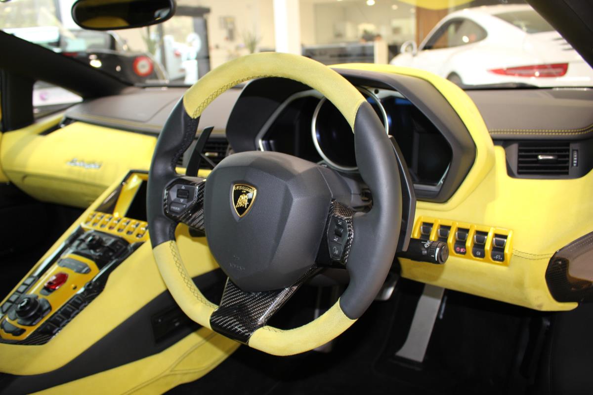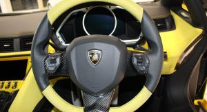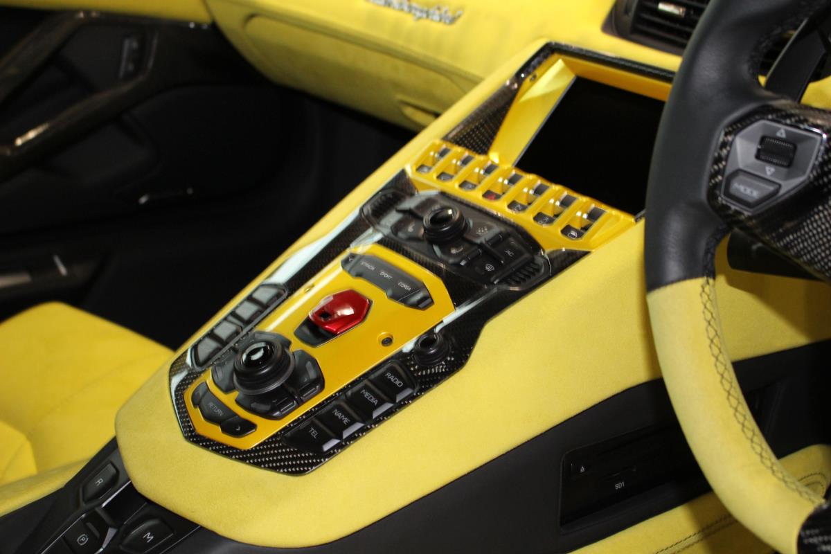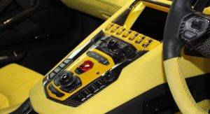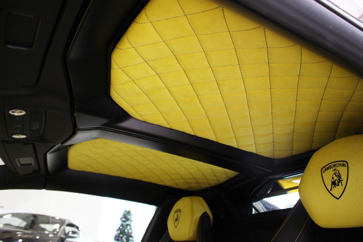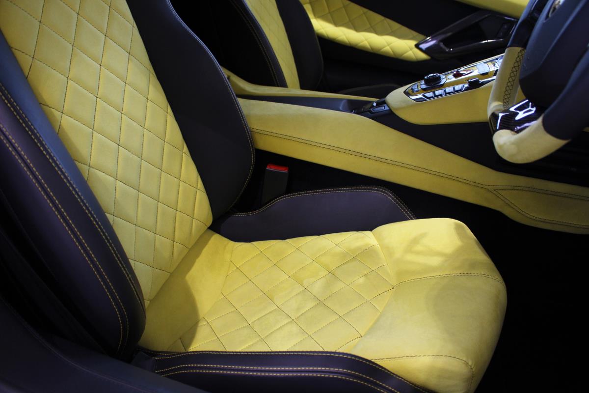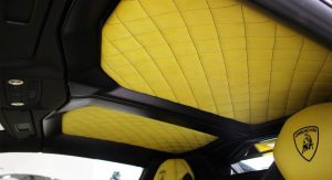 Perhaps the most interesting aftermarket component of this Aventador are the 20-inch and 21-inch wheels from Forgiato, made up of yellow and gloss black spokes. Completing the exterior looks at tinted headlights and taillights.