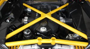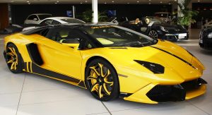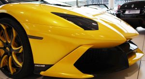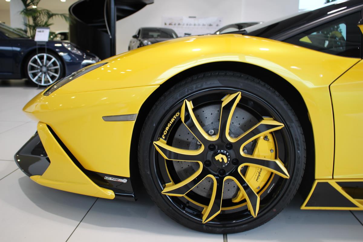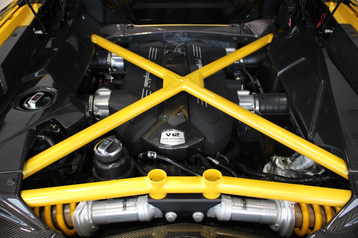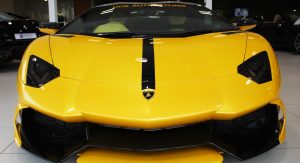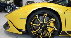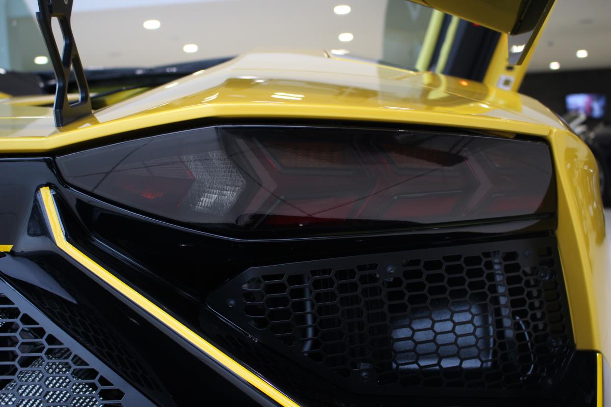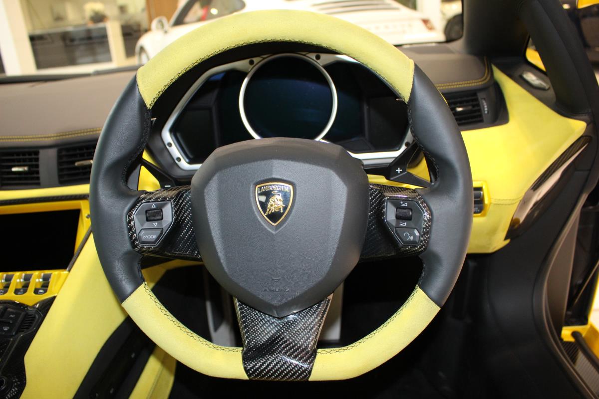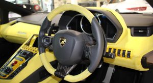 Perhaps the most interesting aftermarket component of this Aventador are the 20-inch and 21-inch wheels from Forgiato, made up of yellow and gloss black spokes. Completing the exterior looks at tinted headlights and taillights.