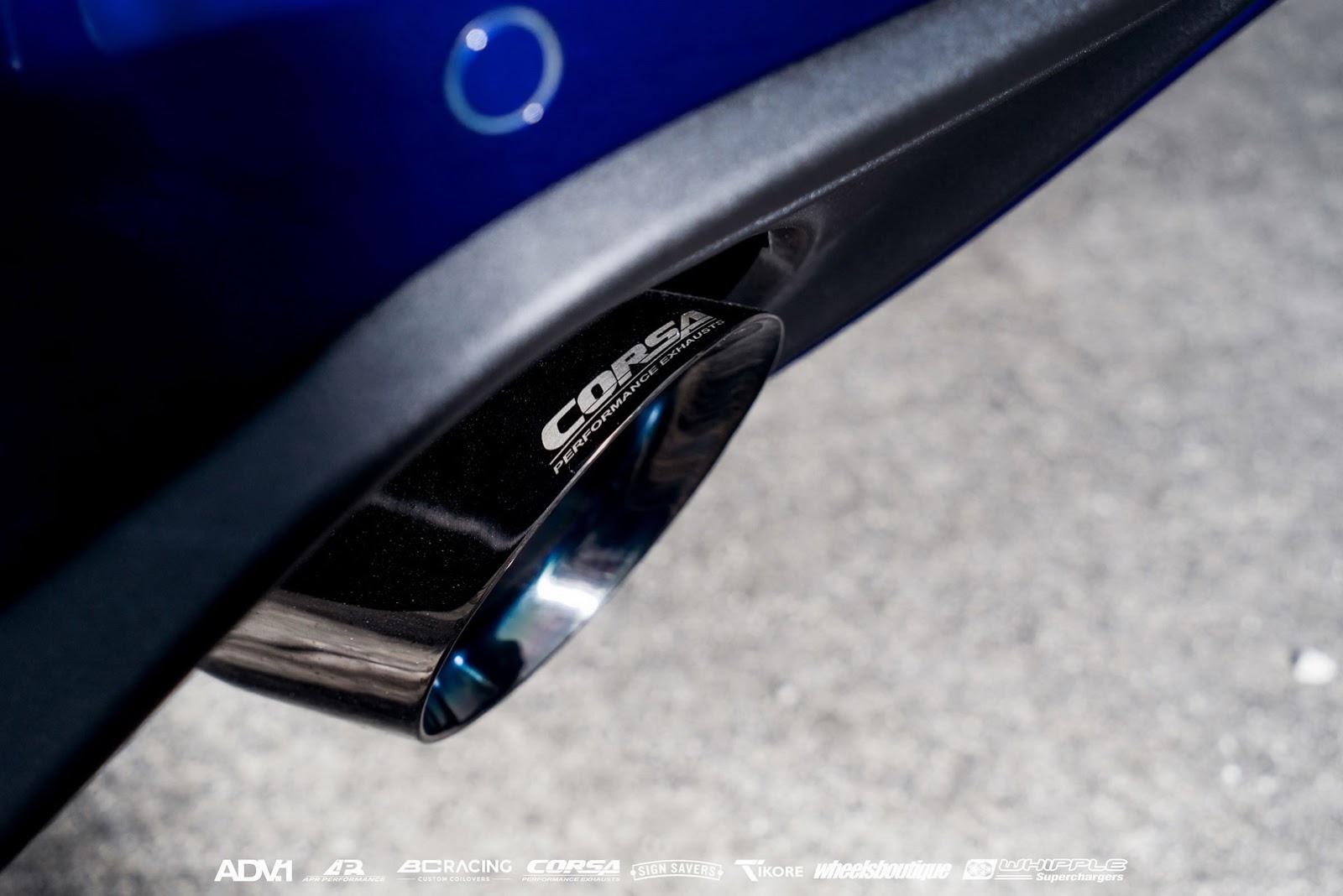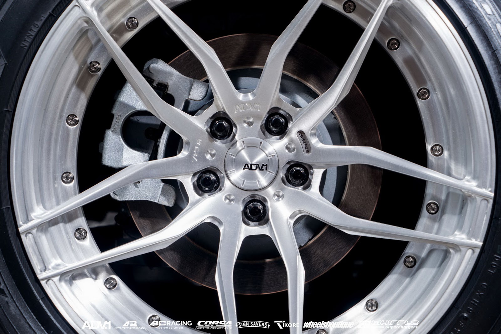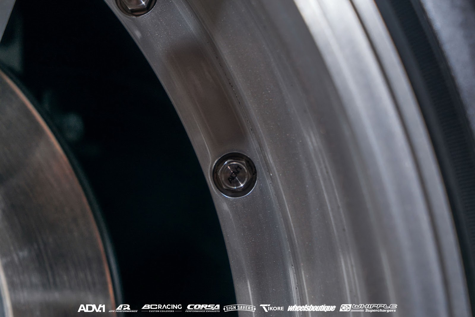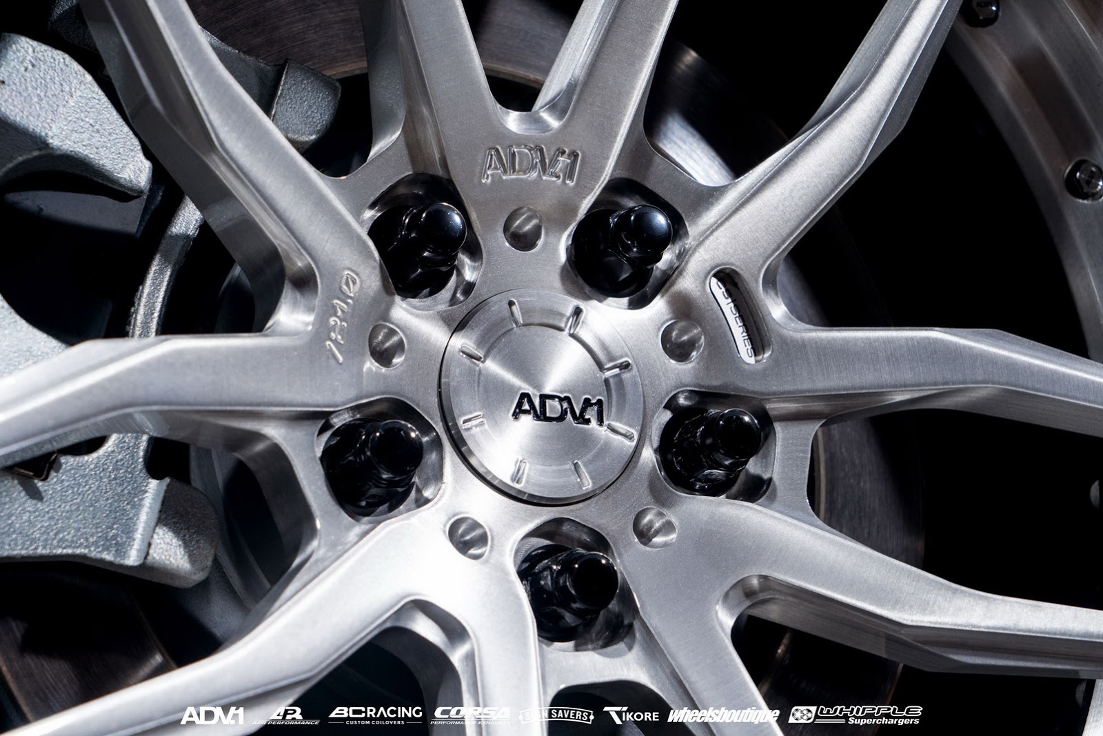 Before we take a closer look at the ADV005 MV2 wheels, let’s run through the performance one more time. So it’s 666 WHP (roughly 750 HP), 510 lb-ft (691 Nm) of torque, all courtesy of a 2.9-liter Whipple supercharger, an ECU tune, Corsa Extreme cat back exhaust system with black PVD tips and BC racing custom coilovers.