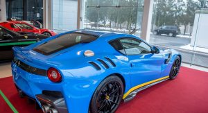 Painted in a shade of Azzurro Dino blue, the most powerful naturally-aspirated model ever overshadows everything else in the local dealership.