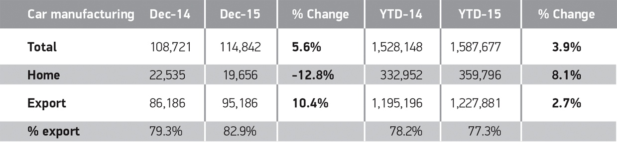 The Society of Motor Manufacturers and Traders (SMMT) states that production increased 3.9 percent on 2014, with 1,587,677 units, a record number of cars, out of which 1,227,881 units left the UK for export, representing 77.3 percent of total production, up 2.7 percent compared to 2014.