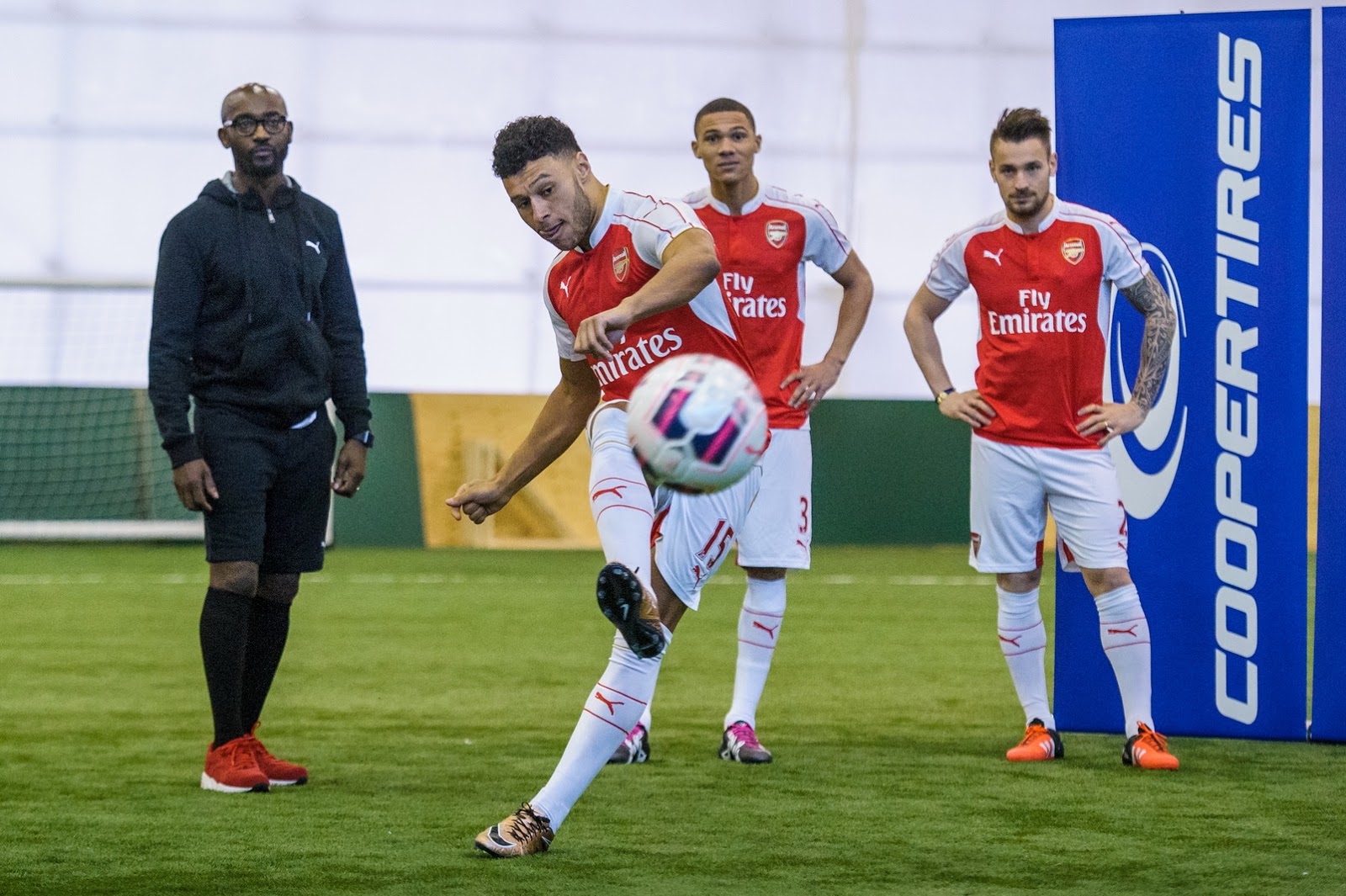 The video shows Arsenal stars Alex Oxlade-Chamberlain, Mathieu Debuchy and Kieran Gibbs trying to kick the ball through a rolling tire which is either bouncing in front of the net or rolling across the crossbar. The tire in question is none other than the Cooper Zeon 4XS Sport, which is high performance SUV rubber.
