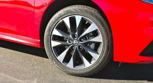 Like the Altima, grafting the new front (the designer says it’s a new car from pretty much the windshield forward) makes it really look like the car was designed at two different times. Still, there’s a net gain in terms of making the Sentra look more interesting. LED headlights have emerged up front, available on SR and SL grades, and new 16-inch wheels are standard on lesser models.