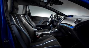 The color theme continues inside where the automaker used blue stitching on the steering wheel and gear shift, while suede and leather are found on the front seats, along with a carbon tape with blue piping that runs on the center and upper outer areas of the seat and continue into the suede door lining. The black roof lining reminds of the Civic Sport and Civic Type R.