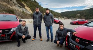 Used to driving either two or four wheels on the race track, Honda motorsport racers Marc Marquez, Dani Pedrosa, Toni Bou and Tiago Monteiro got their hands on the brand-new Civic Type R road car.