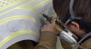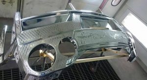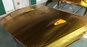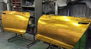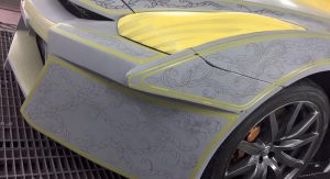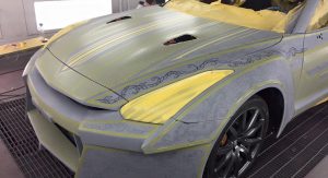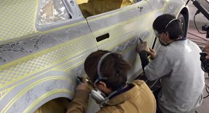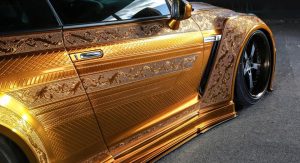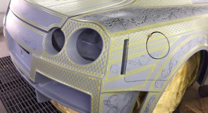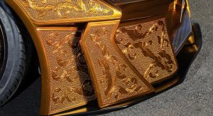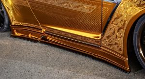 The widebody kit started out as most do, in what appears to be fiberglass. Artists then drew intricate shapes across the entire body of Godzilla and then, expert engravers carved out these designs into the custom body panels.