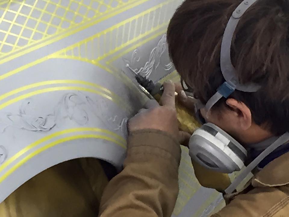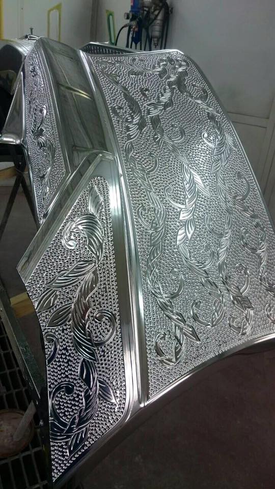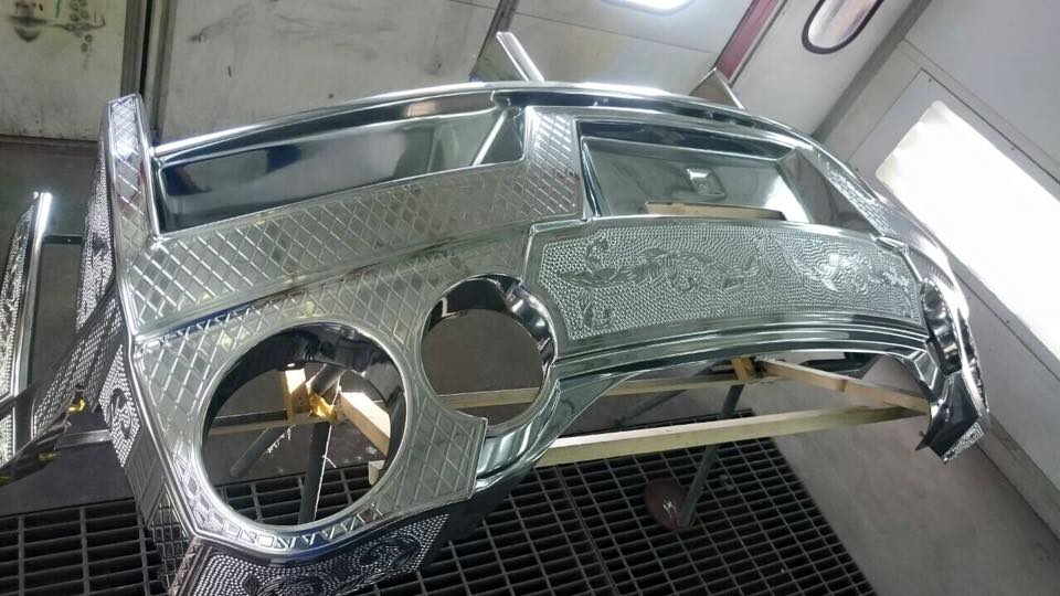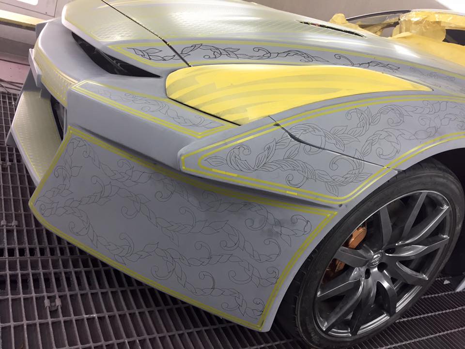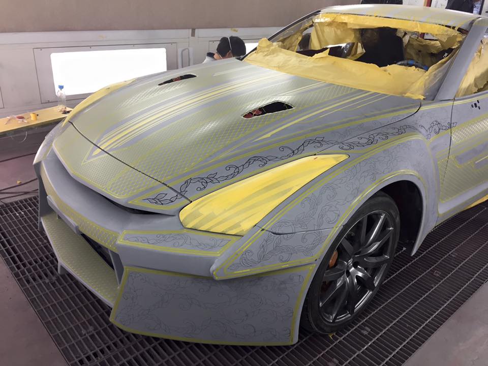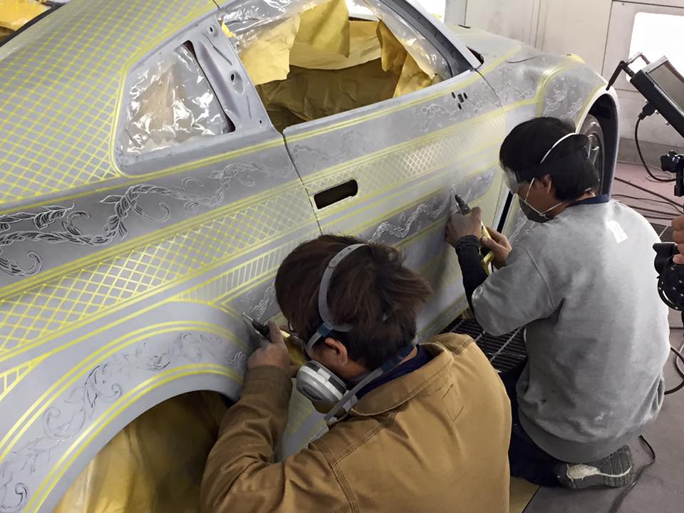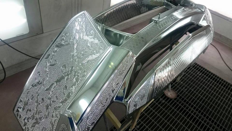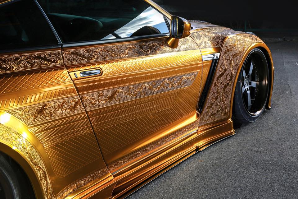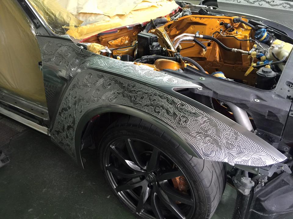The widebody kit started out as most do, in what appears to be fiberglass. Artists then drew intricate shapes across the entire body of Godzilla and then, expert engravers carved out these designs into the custom body panels.