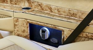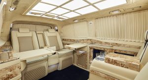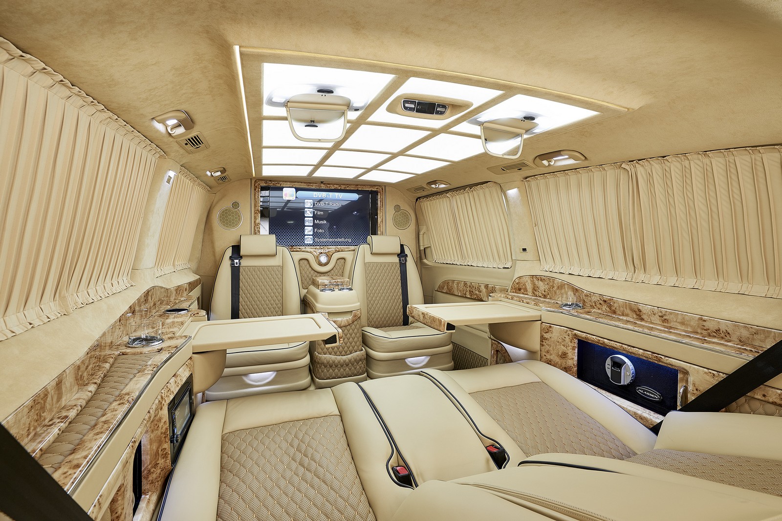The interior modifications are completed with retractable tables, hidden power sockets, rear privacy curtains and an advanced biometric safe.