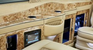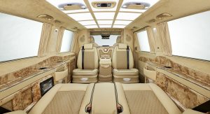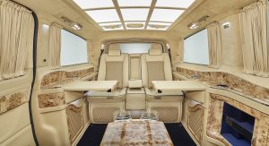 Consequently, the interior combines only the very best leather and alcantara and includes four reclining seats. There are also a number of wooden trimmings throughout, a high-end Alpine audio system, large flat screen TV and even an airplane-inspired minibar.