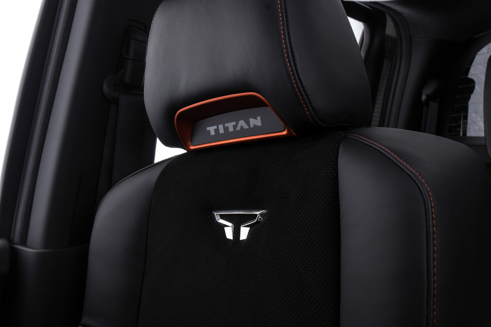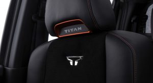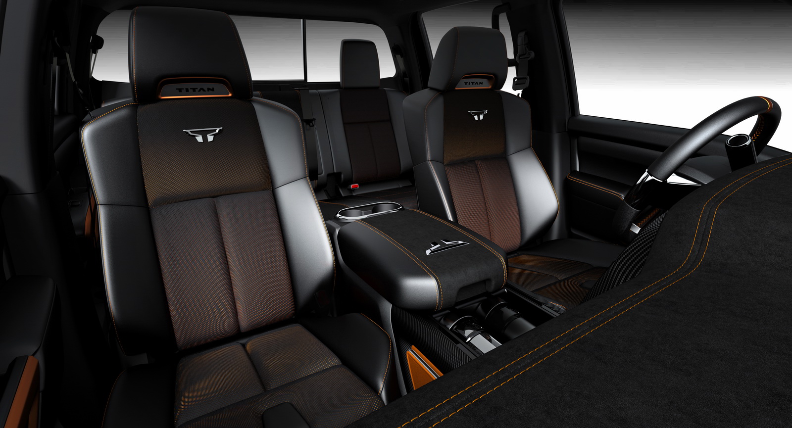 Painted in a custom matte gunmetal shade called ‘Thunder’, with orange and black details, the exterior shape of the Titan Warrior was styled to look like it wears a protective armor in order to give it an edgier, more machine-like appearance. The grille and LED headlights were enhanced, the front and rear fenders are now flared, LED off-road lights were mounted on the roof while functional hood vents were installed for cooling the engine.