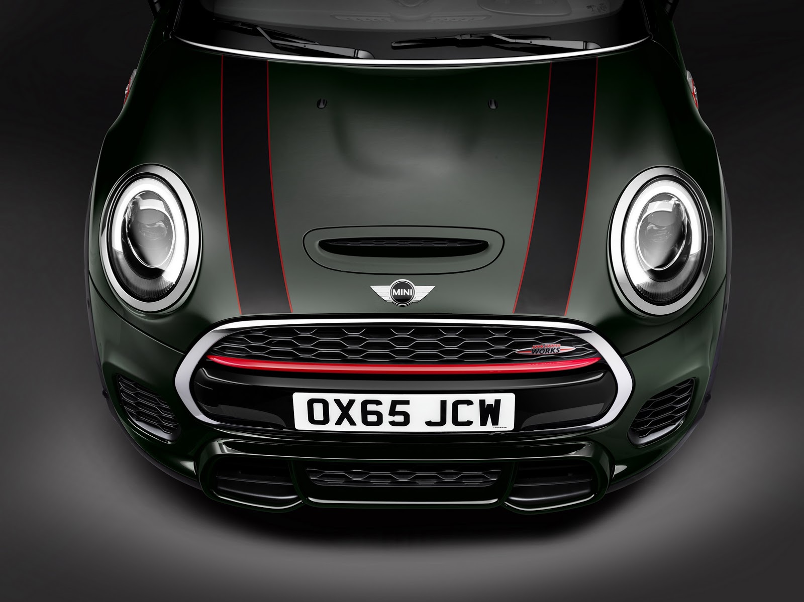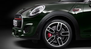 Together with the more potent powertrain, the JCW model gains a dual pipe sports exhaust, re-tuned suspension, 17-inch wheels in 205/45 tires or optionally, 18-inch rims, and a series of cosmetic exterior upgrades such as the model-specific bumpers with enlarged ducts, LED headlamps, spoilers, red brake calipers and wider sills.