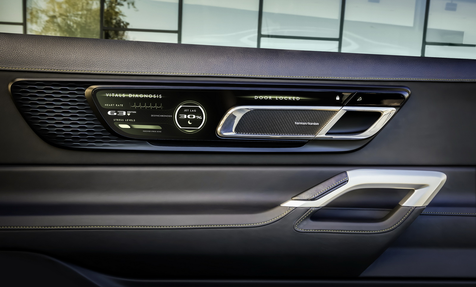 Each of these captain’s seats are embedded with sensors that capture the passenger’s vital information which are then displayed on the interior door panel screens and synchronized with a Light Emitted Rejuvenation system (LER).