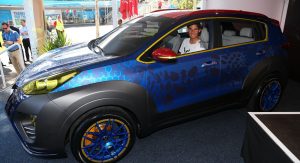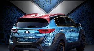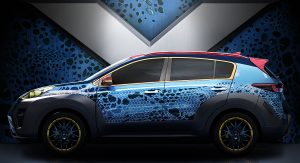 Kia’s creation is a one-off based on the Sportage and it carries a unique design with a special textured matte and gloss blue finish, yellow bodywork highlights, and racing wheels and tires.