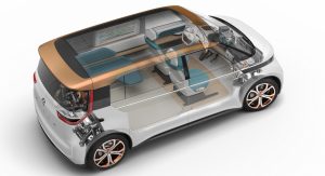 The Volkswagen Budd-e Concept is underpinned by a new platform dubbed Modular Electronic Toolkit, created specifically for plug-in vehicles. Power is provided by a 101 kWh battery pack across the floor of the concept and mated to an electric motor at the front and an electric motor at the rear, making the concept all-wheel drive and capable of reaching 93 mph.