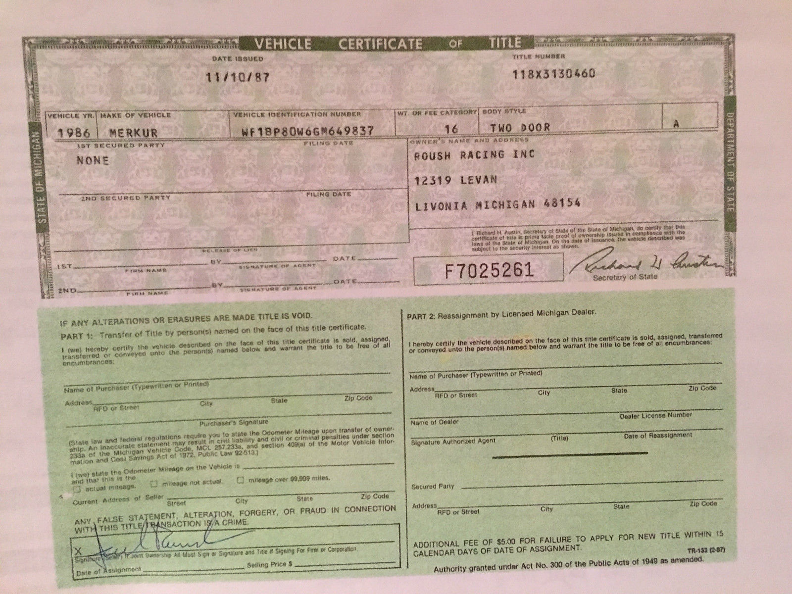 Speaking of the future owner, he or she should know that this is a “rare one-of-a-kind” model, made in 1986 and prepared for the 1987 Detroit Grand Prix. The car was in the original possession of Roush Racing (title signed by Jack Roush), who did all the modifications and upgrades.