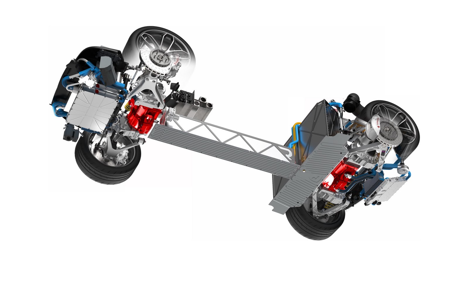 Completing the powertrain is a battery pack designed to deliver 1000 kW or 1MW of power during acceleration.