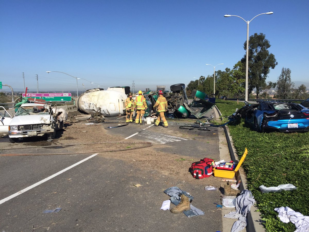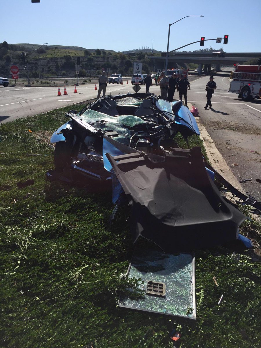 According to authorities, the accident happened Thursday morning at around 8:40 a.m. when a gardening truck collided with a cement truck, which then tipped over onto an offramp, crushing the BMW i8 hybrid sports car.