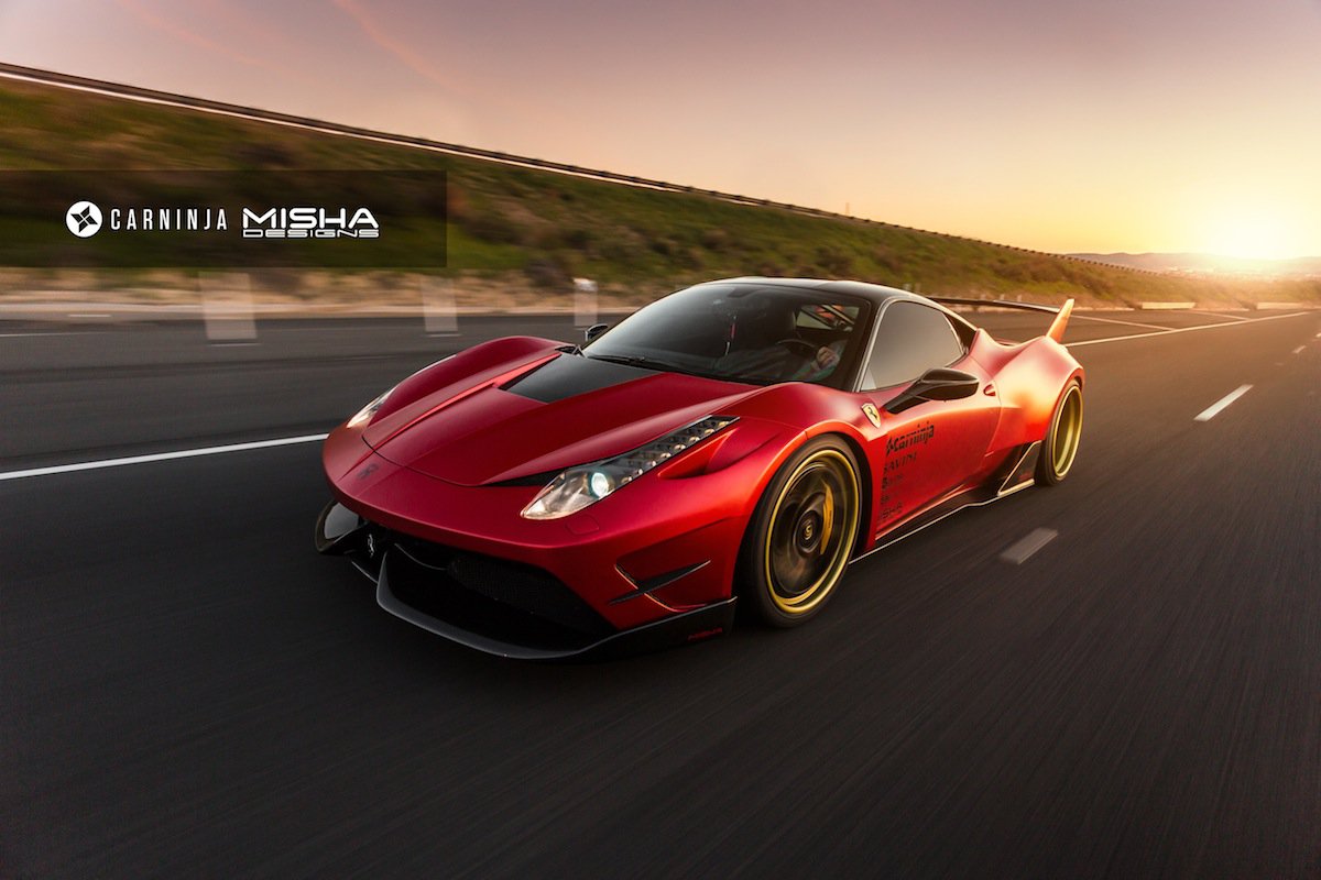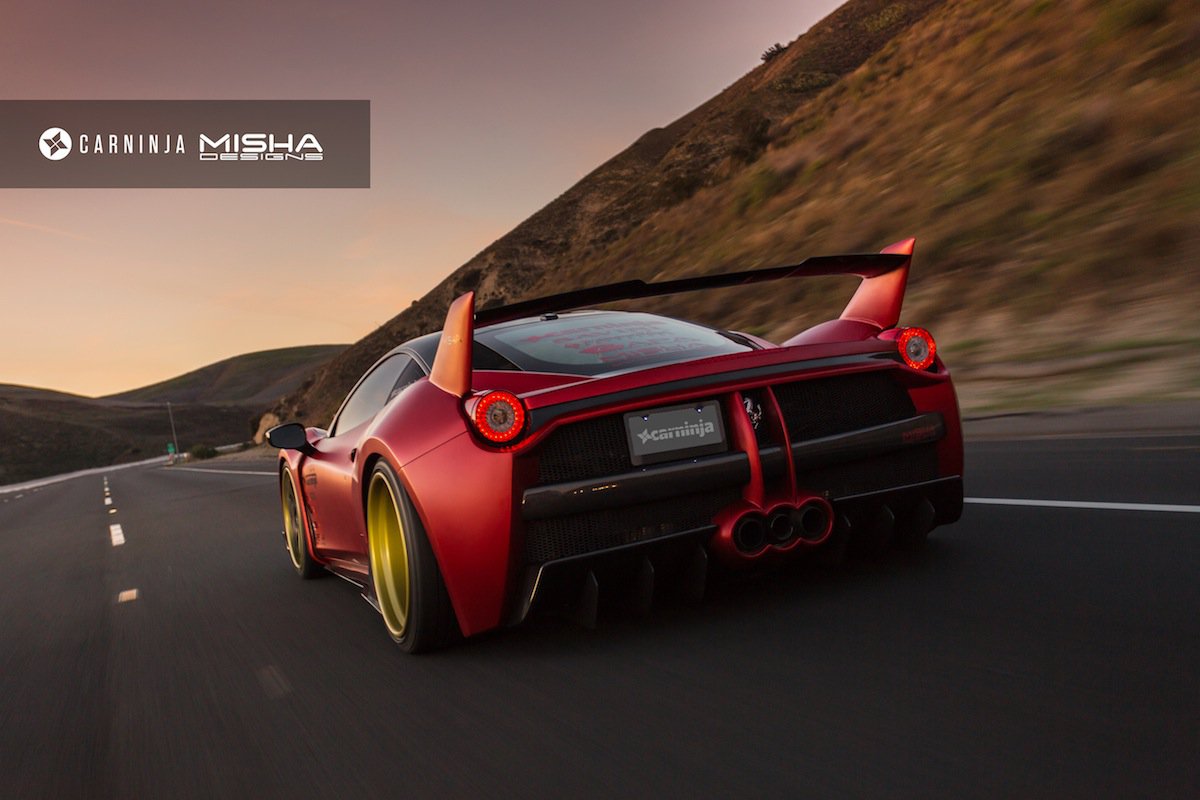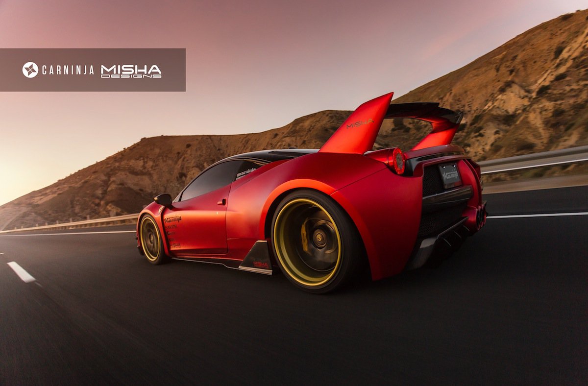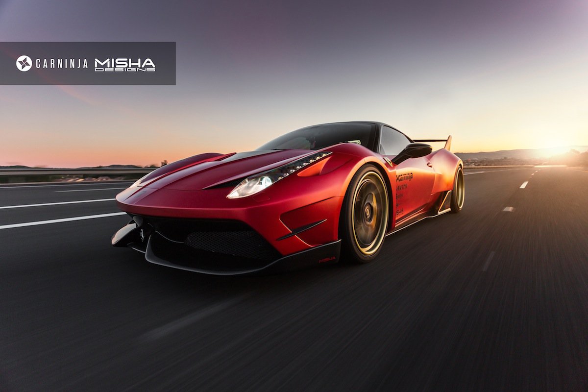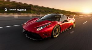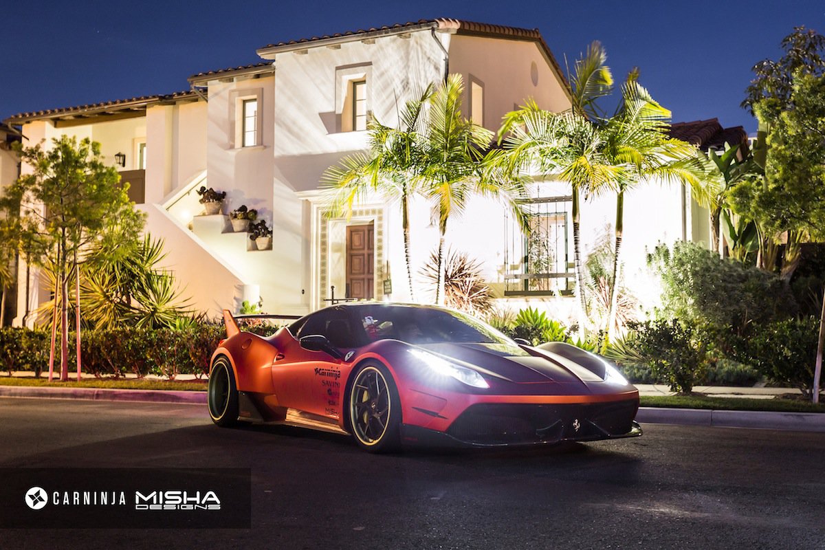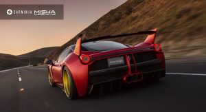 Misha Designs left the 458’s howling 4.5-liter V8, focusing instead on styling. Its widebody kit transforms the Ferrari into a much more aggressive looker, with seems almost as a smaller version of a track-only version special like the FXX K.