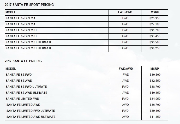 The new 2017 Hyundai Santa Fe and Santa Fe Sport is arriving at the dealers now with prices starting at $25,350 for the FWD Sport 2.4L model and $30,800 for the FWD Santa Fe SE model.