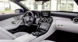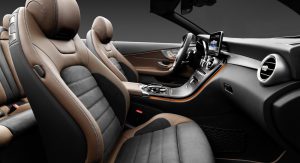 The four-seat interior is based on the C-Class Coupe, adding standard automatic belt extenders as well as the option of heat reflecting leather seats in five different shades plus Merc’s AIRSCARF neck-level heating.