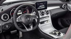 The Germans say that they have beefed up the chassis with many components from the C63 AMG Coupe, including the three-stage RIDE CONTROL sport suspension with adaptive variable damping, the steering knuckles, load-bearing joints and the elastokinematic adjustments to the links. There’s also a larger braking system with internally ventilated compound brake discs, perforated at the front with a diameter of 14.2-in., and with a diameter of 12.6-in. at the rear