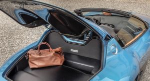 They weigh just 3.5 kg (7.7 lbs) and contribute in lowering the center of gravity. The carbon roof can be removed by hand and stowed in the boot, alongside a bespoke luggage set.