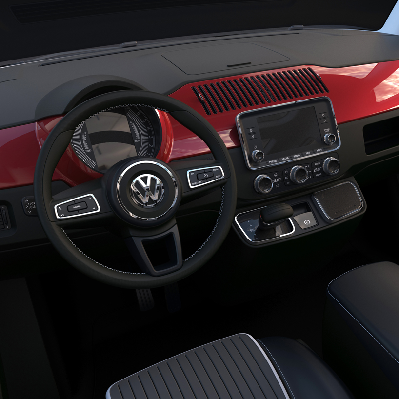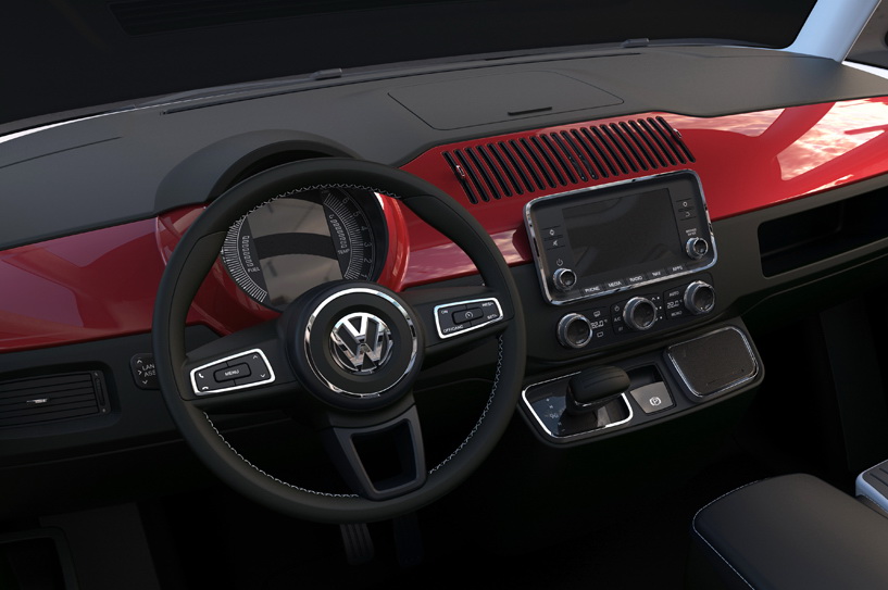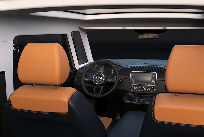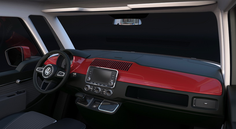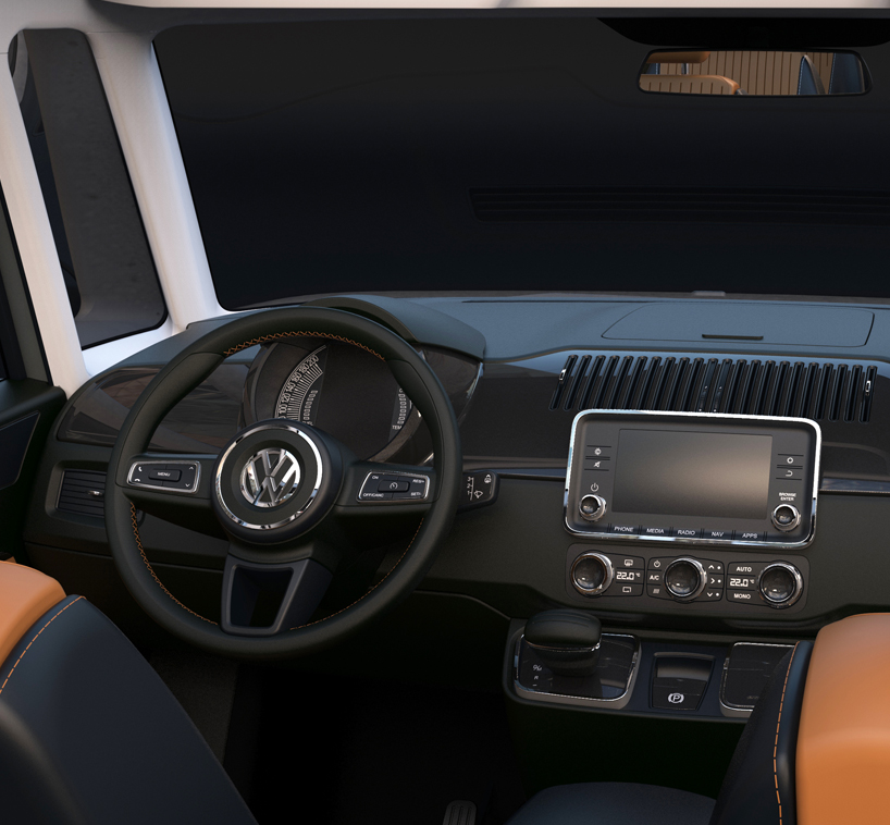 “The interior sees a fusion of modern technology and evocative elements, with the dashboard echoing the color of the vehicle’s exterior, forging a stylistic connection even with the current generation of the VW Beetle,” says Obendorfer. “The ventilation vents in the center of the dashboard are a nod to the past, with the original T1 having very similar grids. Chrome door handles and the design of the seats give a retro touch to the passenger cabin.”